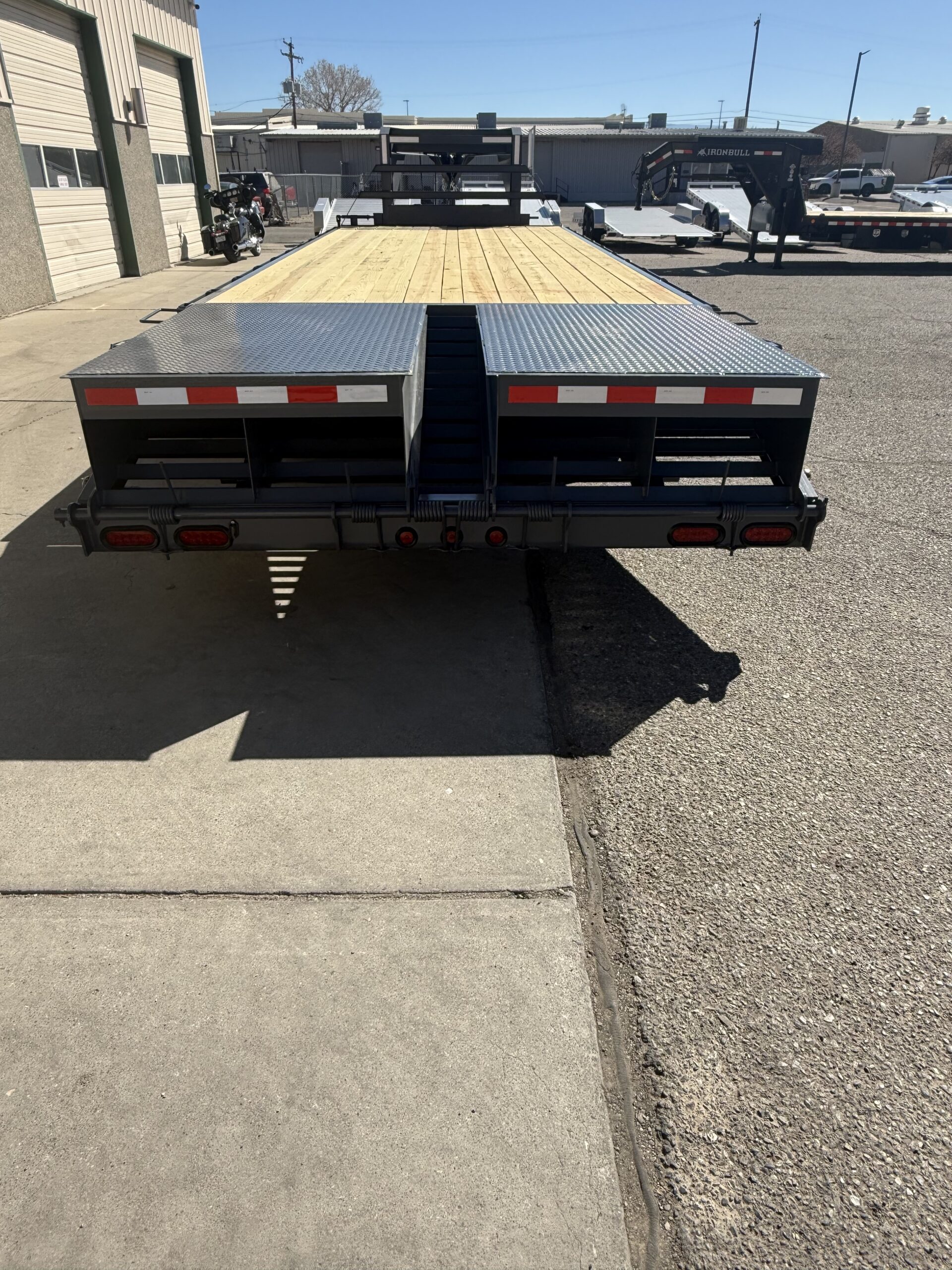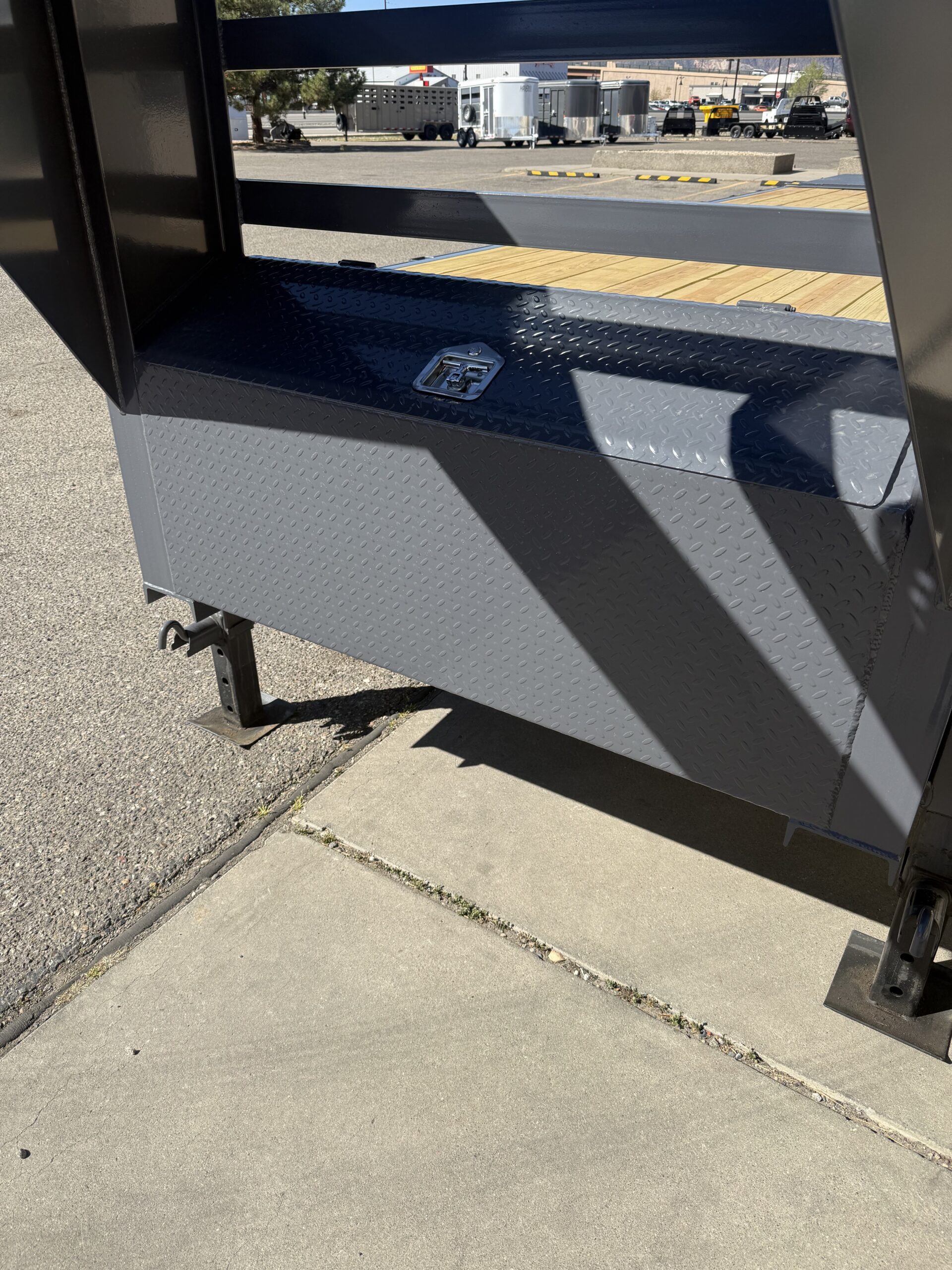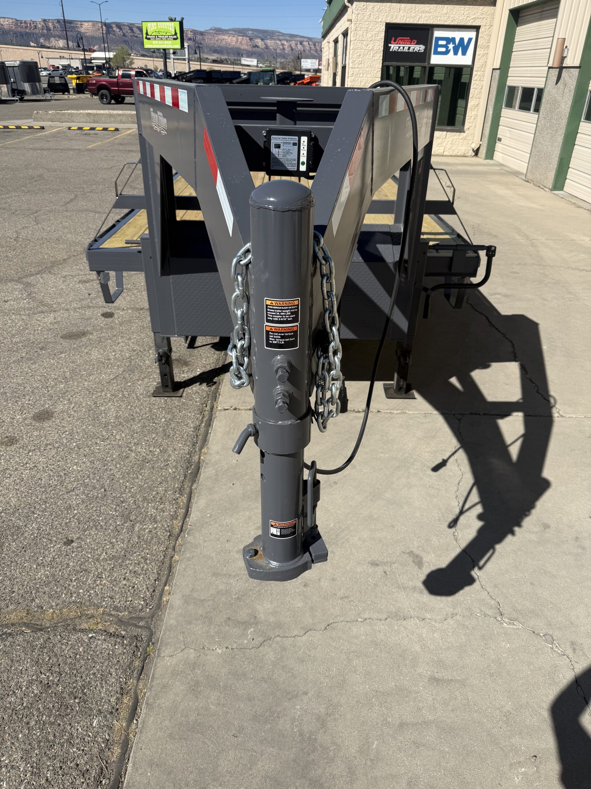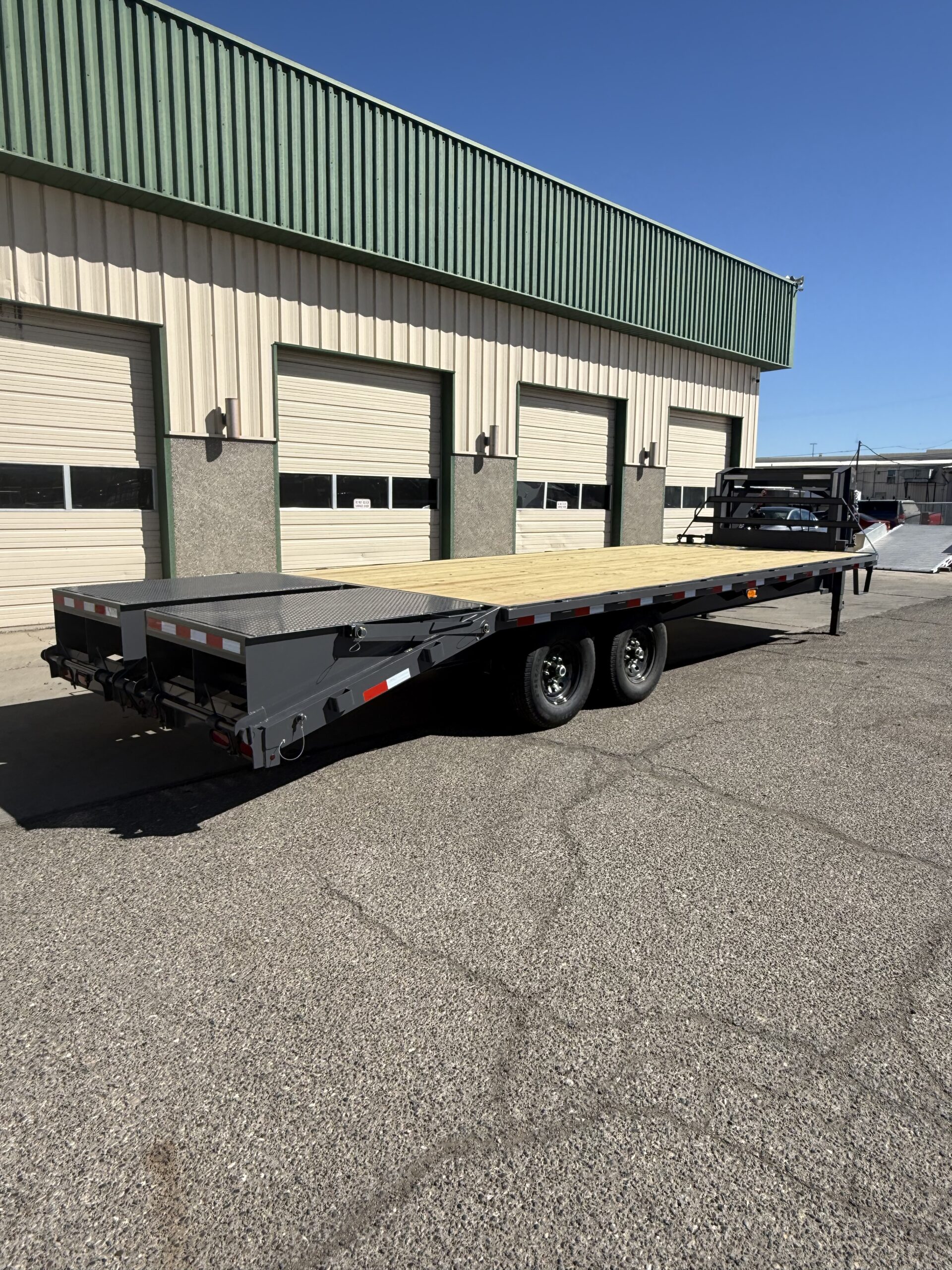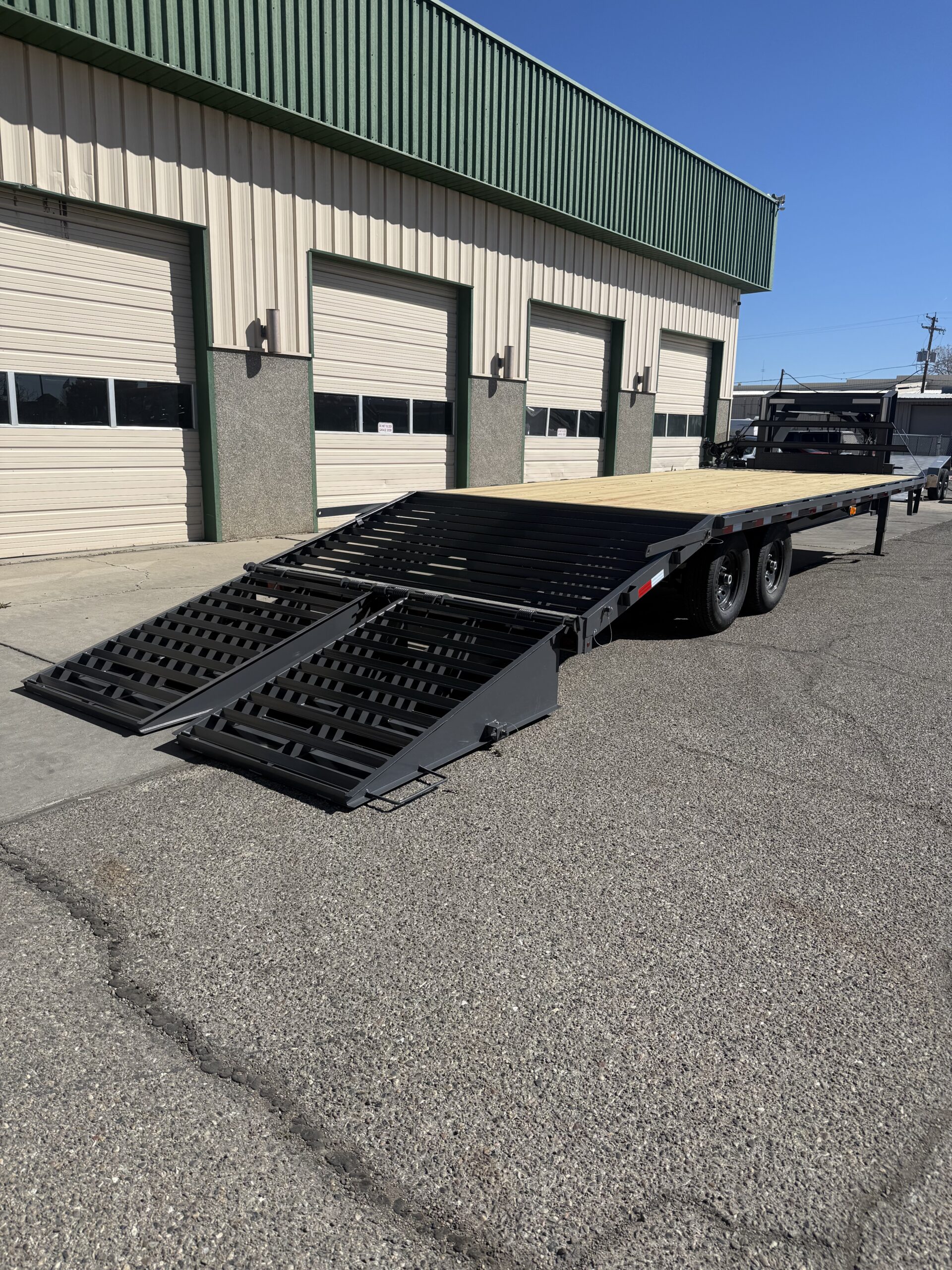 14K Rated, 20’ Deck + 5’ Dove Tail,, Flip Over Ramps, Side Step, Powder Coated, Stake Pockets Rub Rail, Dual Jacks, Chain Tray Between Jacks, Adjustable Coupler, All LED Lighting, Radial Tires, Electric Brakes On All Wheels, Spare Tire Carrier, Reflective DOT Marking Tape.