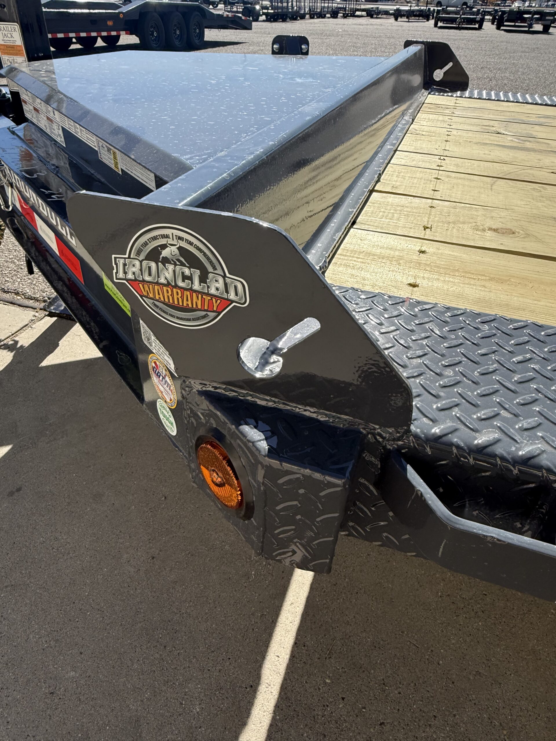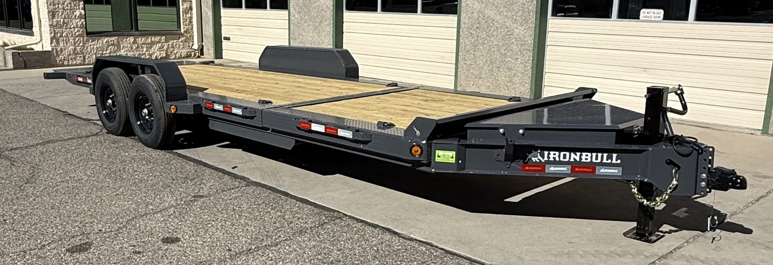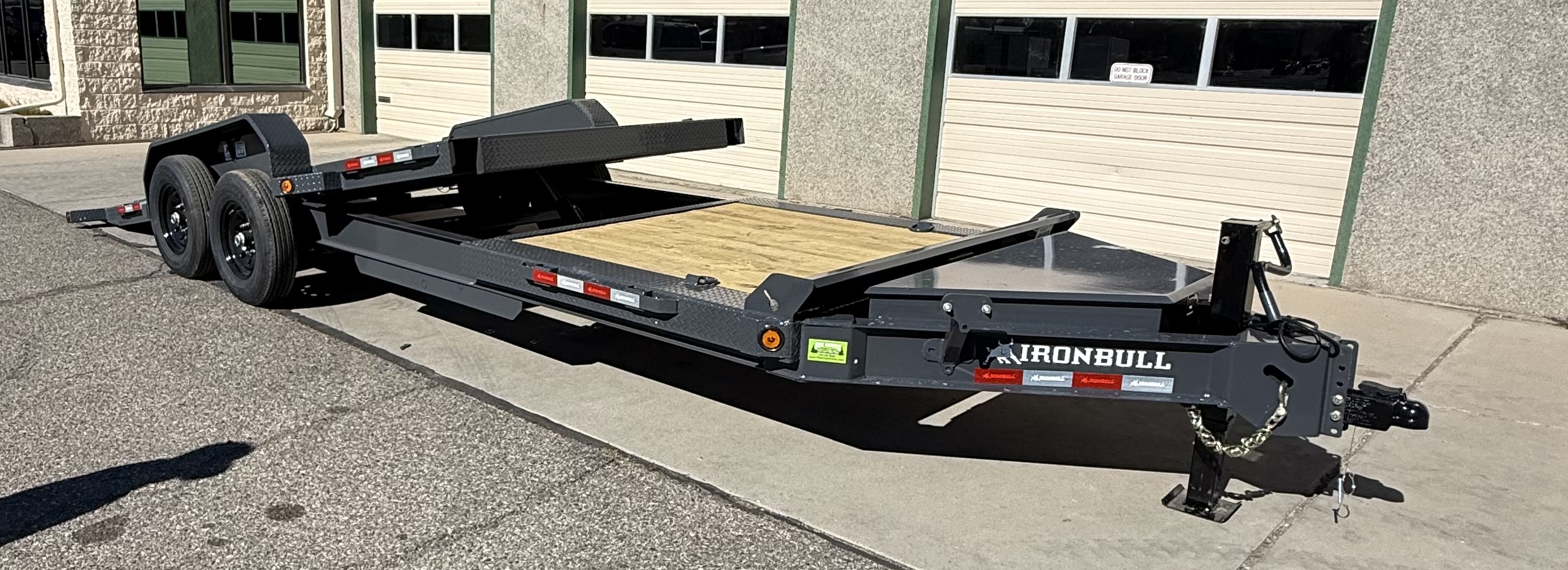 Ironbull 22′ Gravity Tilt Trailer, 14k Rated , 8 I beam Frame 2 5/16 Adjustable Couple, 10 k Rated Spring Loaded Jack, Treated Wood Floor,Chain Box,Weld on D rings, Spare Tire Mount, Drive Over Fenders, 16 Tilt , 6′ Stationary deck, 10 ply Tires Iron Clad Warranty, Curb Weight: 4376