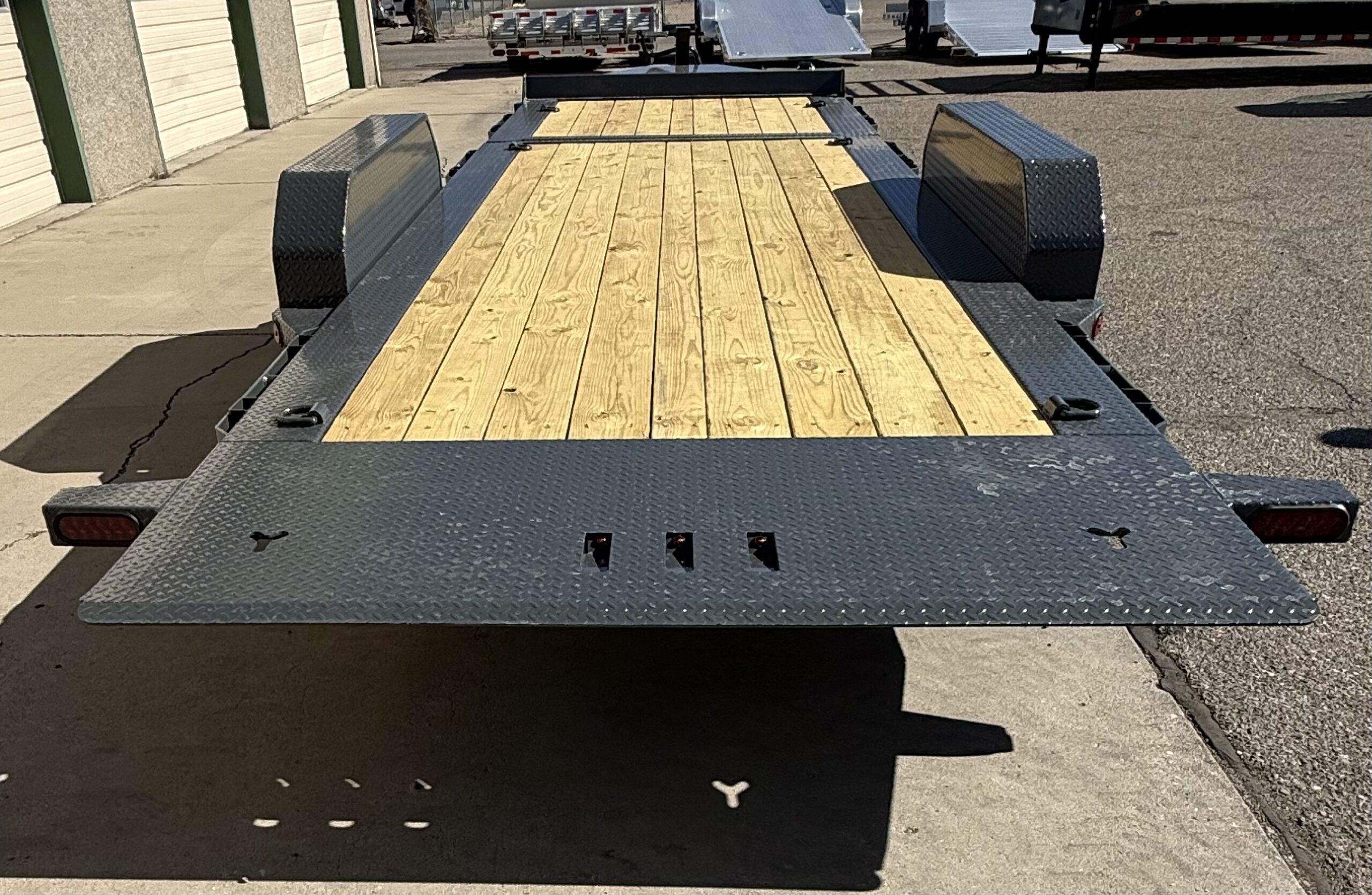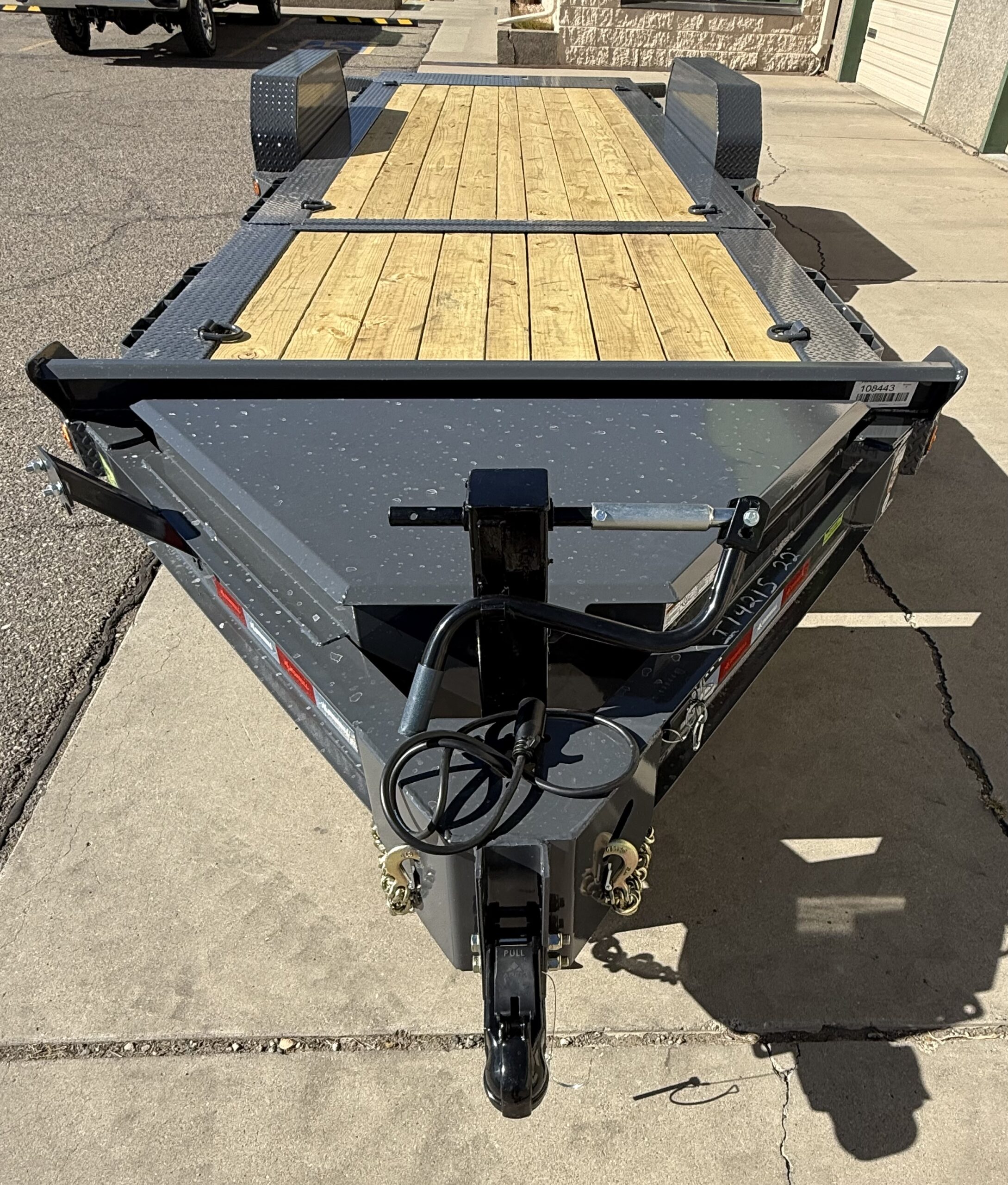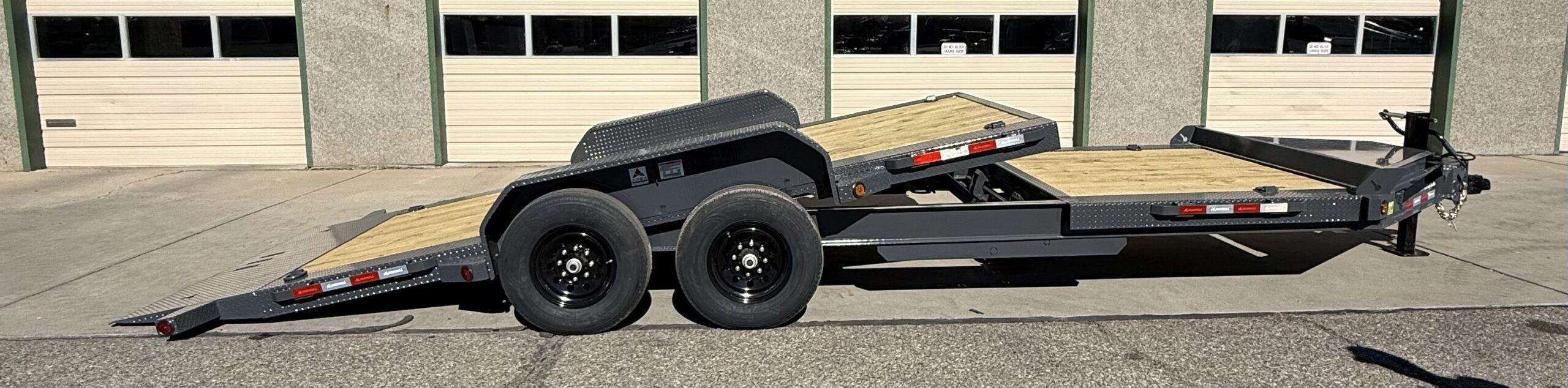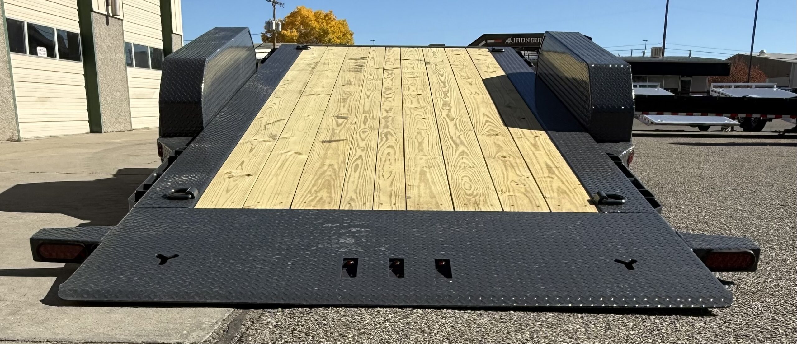 Ironbull 22′ Gravity Tilt Trailer, 14k Rated , 8 I beam Frame 2 5/16 Adjustable Couple, 10 k Rated Spring Loaded Jack, Treated Wood Floor,Chain Box,Weld on D rings, Spare Tire Mount, Drive Over Fenders, 16 Tilt , 6′ Stationary deck, 10 ply Tires Iron Clad Warranty, Curb Weight: 4376