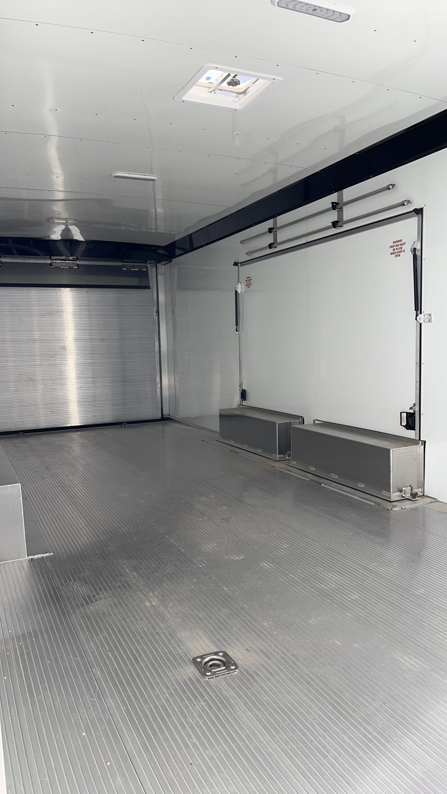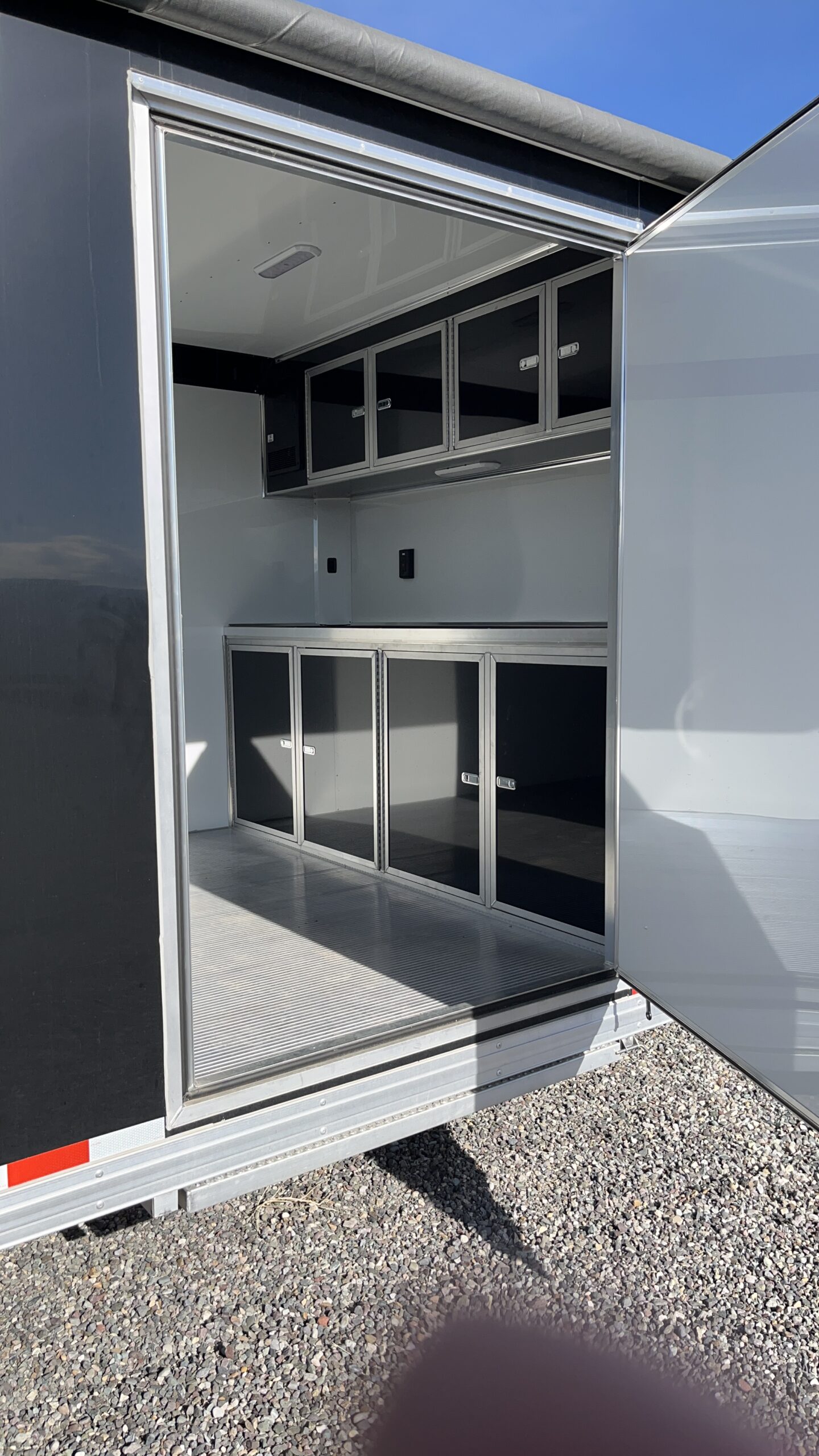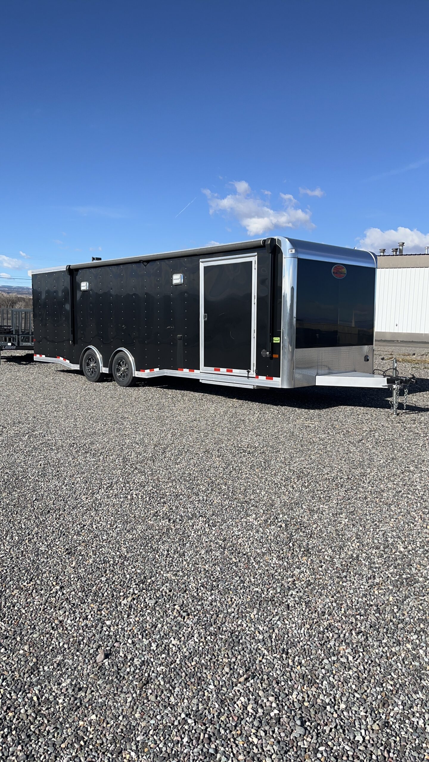 Cable Assisted Ramp Door, 7′ Interior Height, Roof Vent, Pre Wired And Framed For A/C, All Aluminum Frame, Spread Torsion Axles, Custom Aluminum Wheels, Extruded Aluminum Flooring, Flip Up Premiere Escape Door, Removable Wheel Wells, Exterior Flood Lighting, Power Awning, All LED Lighting, .050 Screwless Exterior, ATP Stone Guard, Side Access Door With RV Latch, Rear Spoiler With Loading Lights, Dove Tail, Recessed D-Rings, Aluminum Base And Overhead Cabinets, Insulated, Aluminum Interior Walls, White Vinyl Ceiling Liner, Matching Spare Wheel And Tire, LED Interior Lighting. Empty Weight 5820
