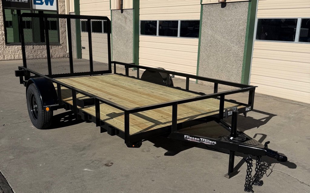 FRIESEN 6-1/2X12 SINGLE AXLE UTILITY TRAILER 48 Rear Ramp Gate, Top Railing, 3500# Axle, 15 Radial Tires, Spare Tire Mount, LED Lighting, Powder Coated, Stake Pockets, Bull Dog Style Coupler.
