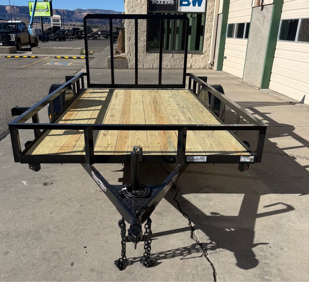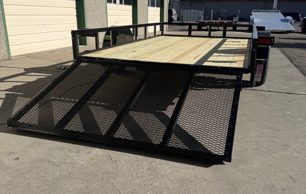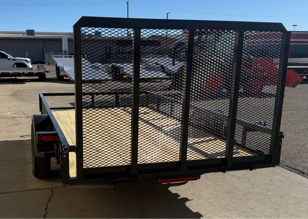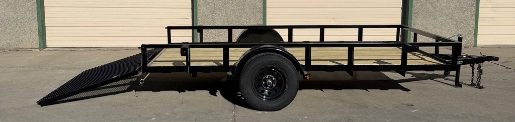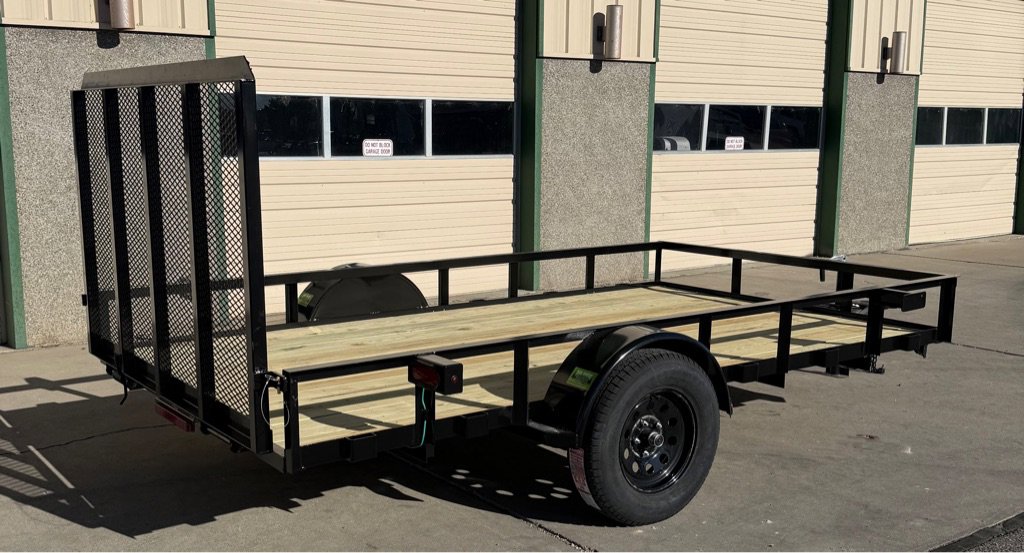 FRIESEN 6-1/2X12 SINGLE AXLE UTILITY TRAILER 48 Rear Ramp Gate, Top Railing, 3500# Axle, 15 Radial Tires, Spare Tire Mount, LED Lighting, Powder Coated, Stake Pockets, Bull Dog Style Coupler.