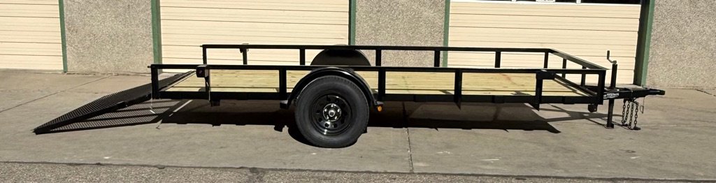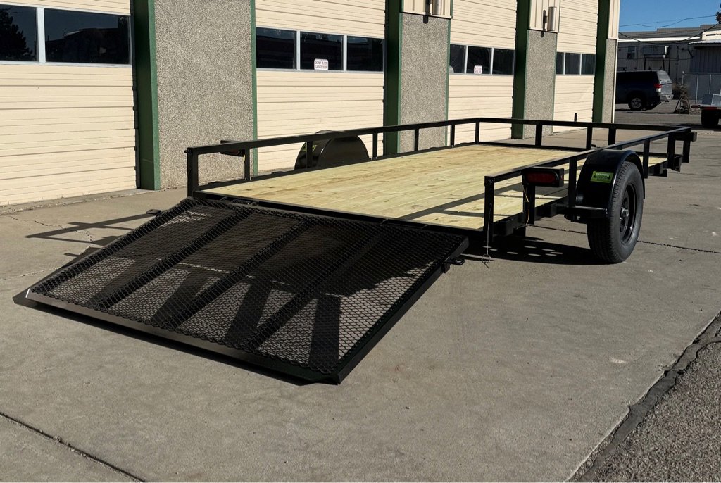 FRIESEN 7X14 SINGLE AXLE UTILITY TRAILER 48 Rear Ramp Gate, Top Railing, 3500# Axle, 15 Radial Tires, Spare Tire Mount, LED Lighting, Powder Coated, Stake Pockets, Bull Dog Style Coupler.