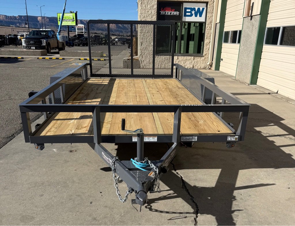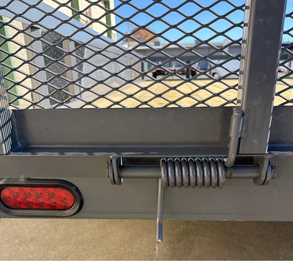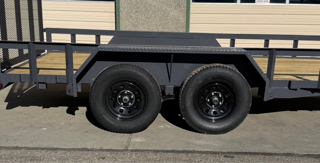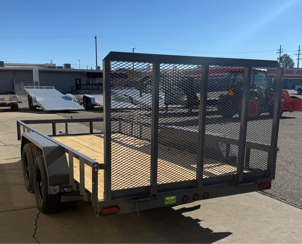 FRIESEN 83 X14′ TANDEM AXLE UTILITY TRAILER 7K Rated, 48 Rear Ramp Gate, Spare Tire Carrier, All LED Lighting, Stake Pockets, Top Railing, Tongue Jack, Bulldog Style Coupler, Electric Brakes On All Wheels, 15 Radial Tires.