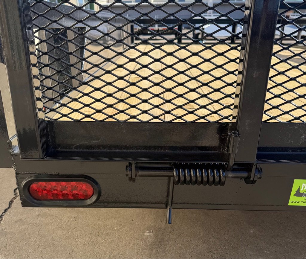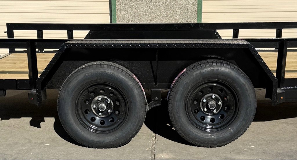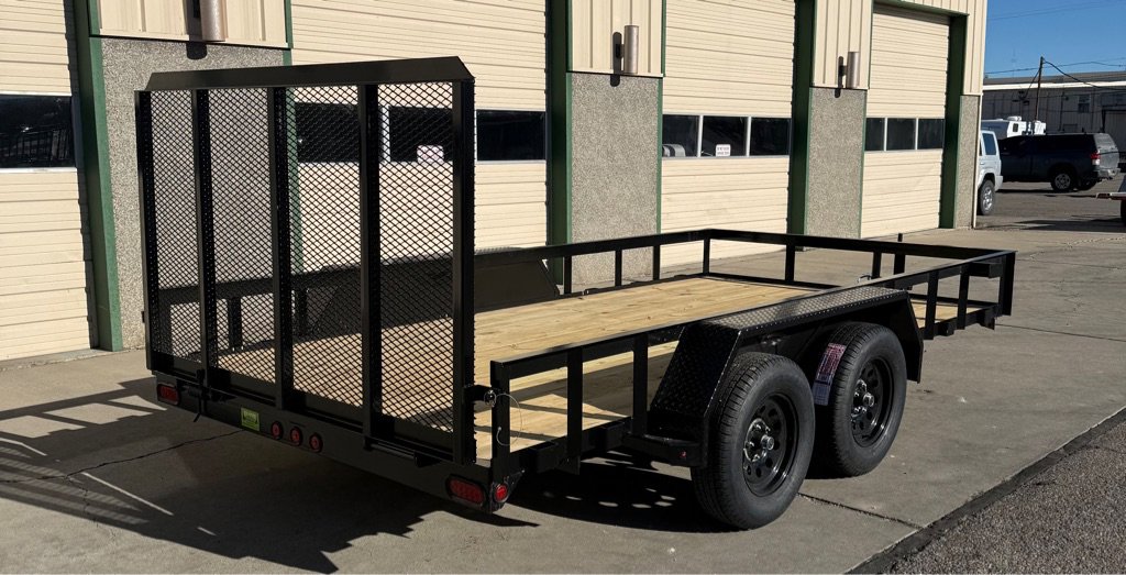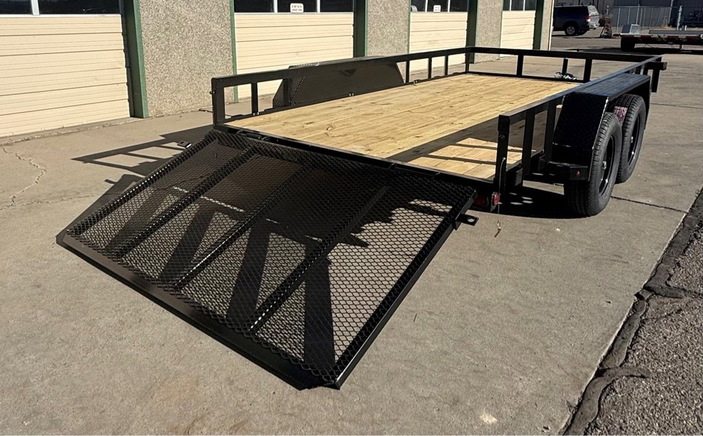 FRIESEN 83 X14′ TANDEM AXLE UTILITY TRAILER 7K Rated, 48 Rear Ramp Gate, Spare Tire Carrier, All LED Lighting, Stake Pockets, Top Railing, Tongue Jack, Bulldog Style Coupler, Electric Brakes On All Wheels, 15 Radial Tires.