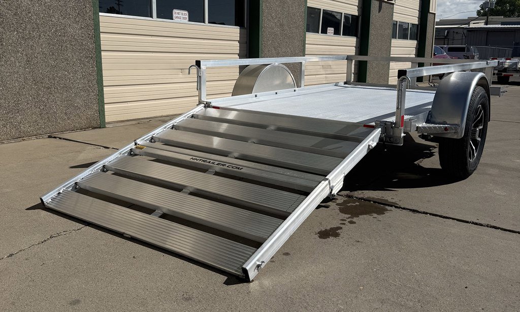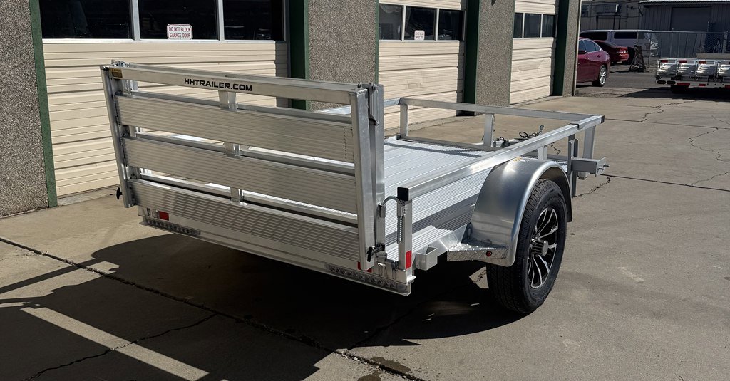 H&H 5’X8′ SINGLE AXLE ALUMINUM UTILITY TRAILER. Bi Fold Rear Ramp Gate, Square Tube Top Railing, Spare Tire Mount, 3500# Axle, 15 Radial Tires, Custom Aluminum Wheels, Extruded Aluminum Decking Stake Pockets, Swivel Up Tongue Jack, All LED Lighting. Empty Weight 650