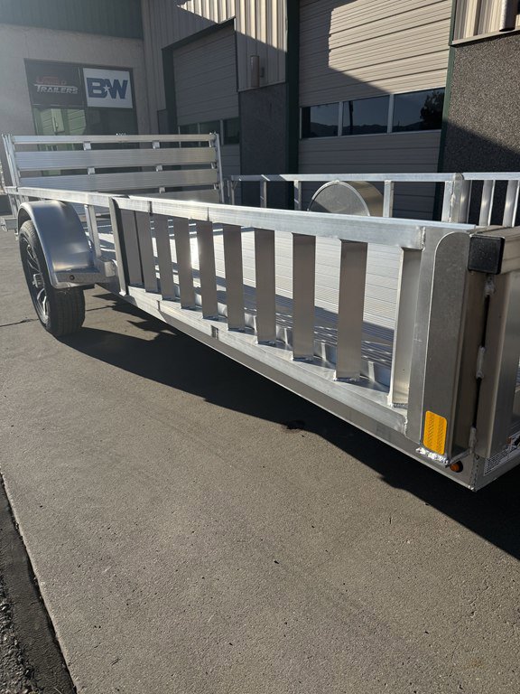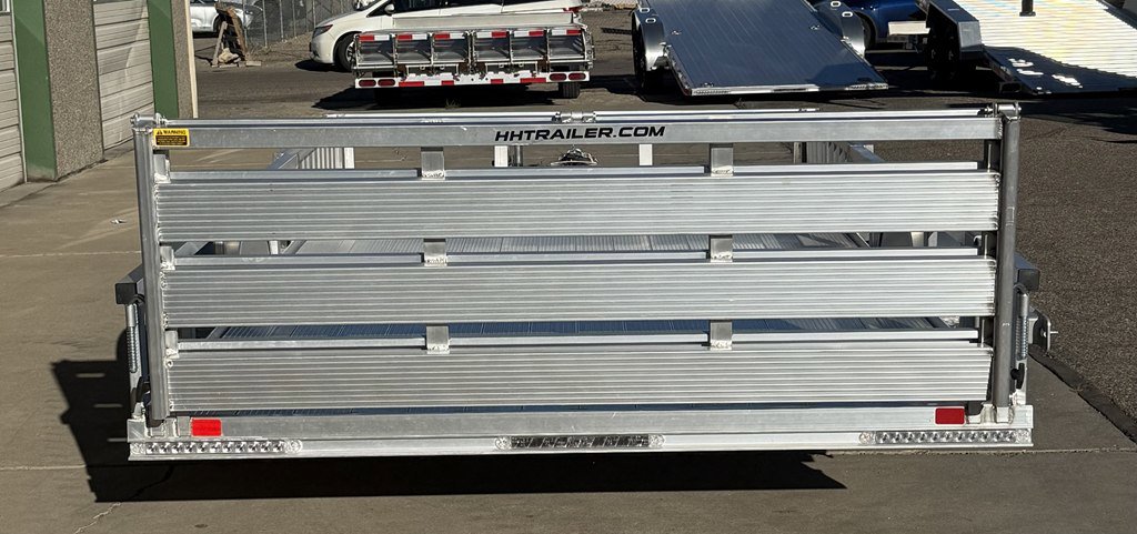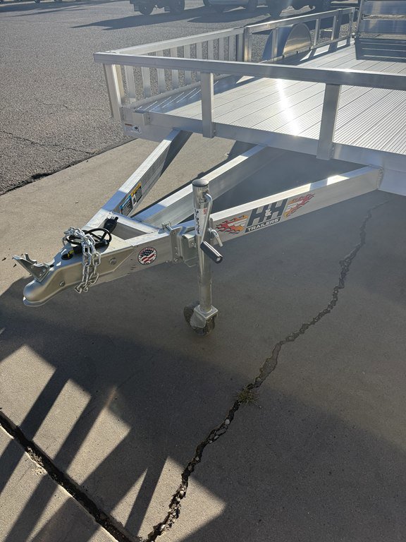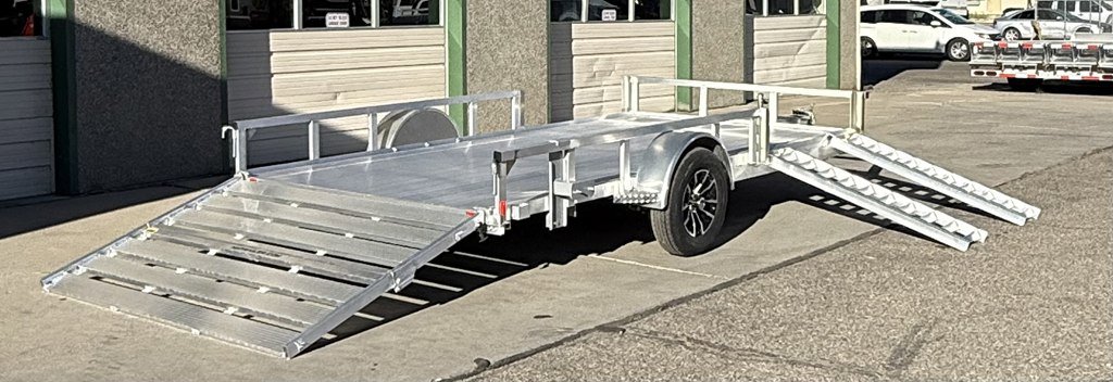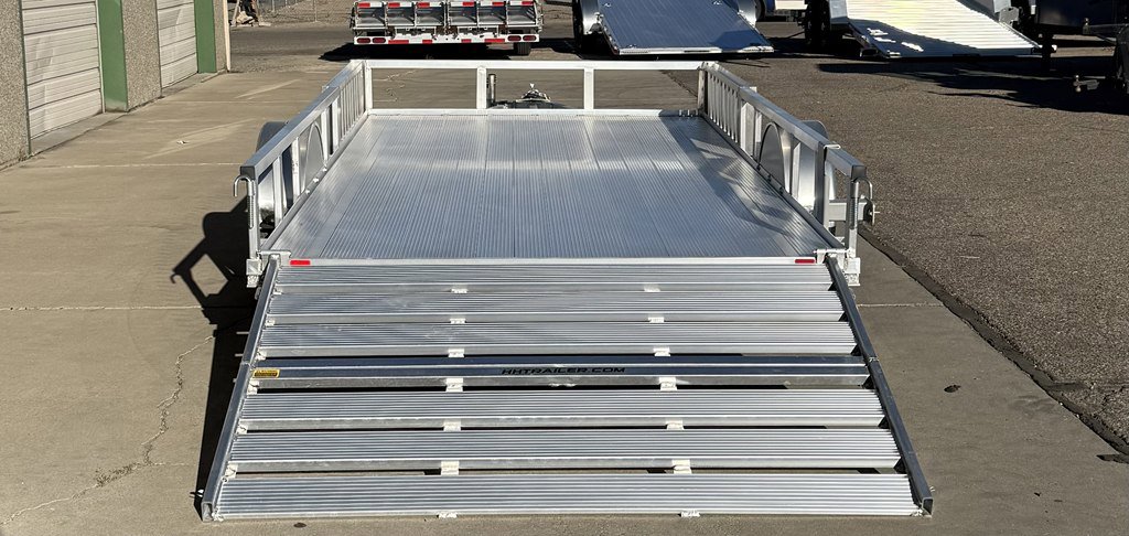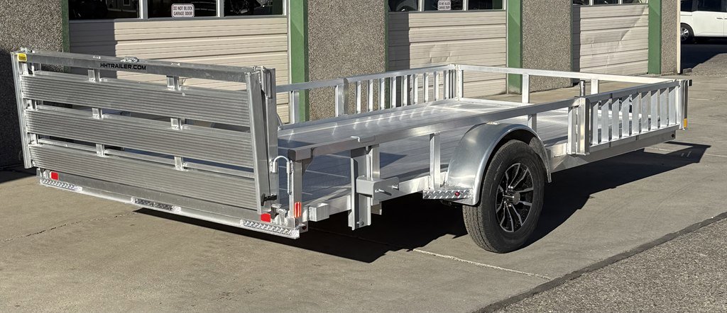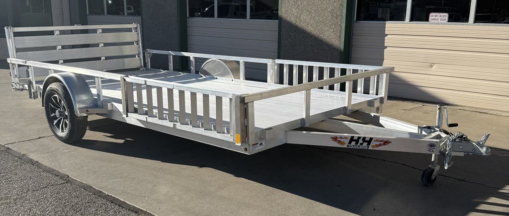 H&H 82”X14′ DUAL RAMP ALUMINUM UTILITY TRAILER Bi Fold Rear Ramp Gate, Aluminum Diamond Plate Solid Side Walls, Spare Tire Carrier, Extruded Aluminum Decking, Swivel Up Tongue Jack, All LED Lighting, Custom Aluminum Wheels, 15” Radial Tires, 3500# Axle
