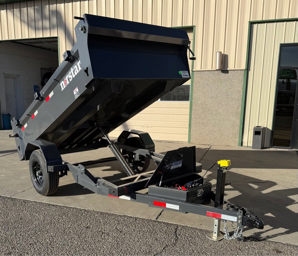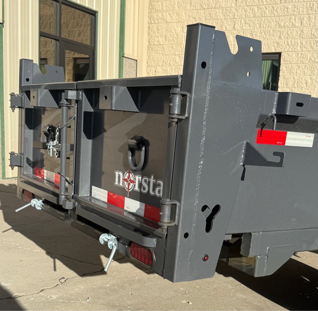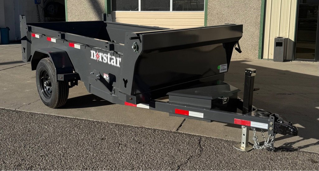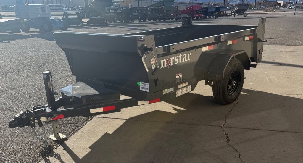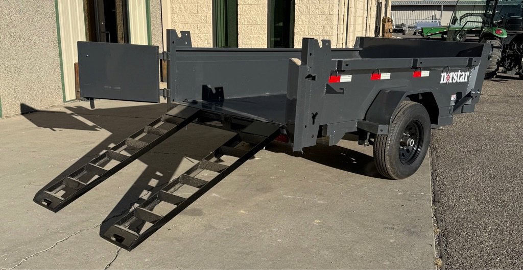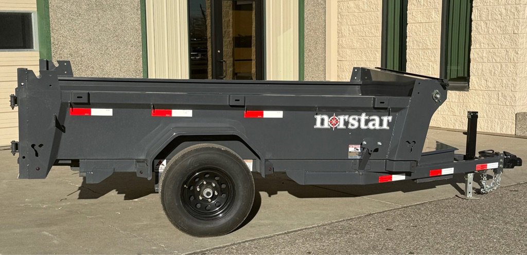 ’10’ Norstar , Dump Trailer, Stake Pockets, LED Lights, Adjustable Coupler ‘ Drop Leg Jack . Loading Ramps , Tarp kit . 15” Radial Tires 5200# Electric Brake Axle , Premium Powder Coat Finish, Curb Weight: 2119