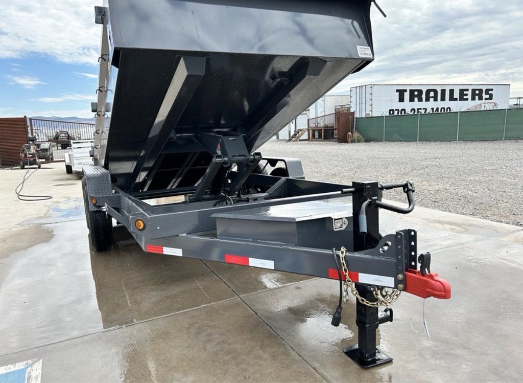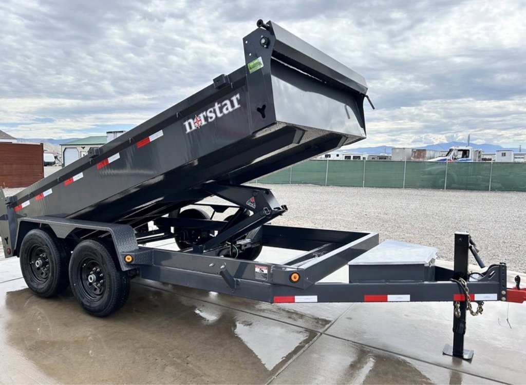 NORSTAR 7’X14′ DUMP TRAILER 14K Rated, Slide Out Ramps, Scissor Style Hoist, Adjustable Coupler, Reflective DOT Marking Tape, Gray Powder Coated, Roll Up Tarp Kit, All LED Lighting, 16” Radial Tires, Electric Brakes On All Wheels, Heavy Duty Diamond Plate Fenders, Heavy Duty Spring Loaded Drop Leg Jack, D-Rings, Spare Tire Carrier, Locking Tongue Box, Iron Clad Warranty