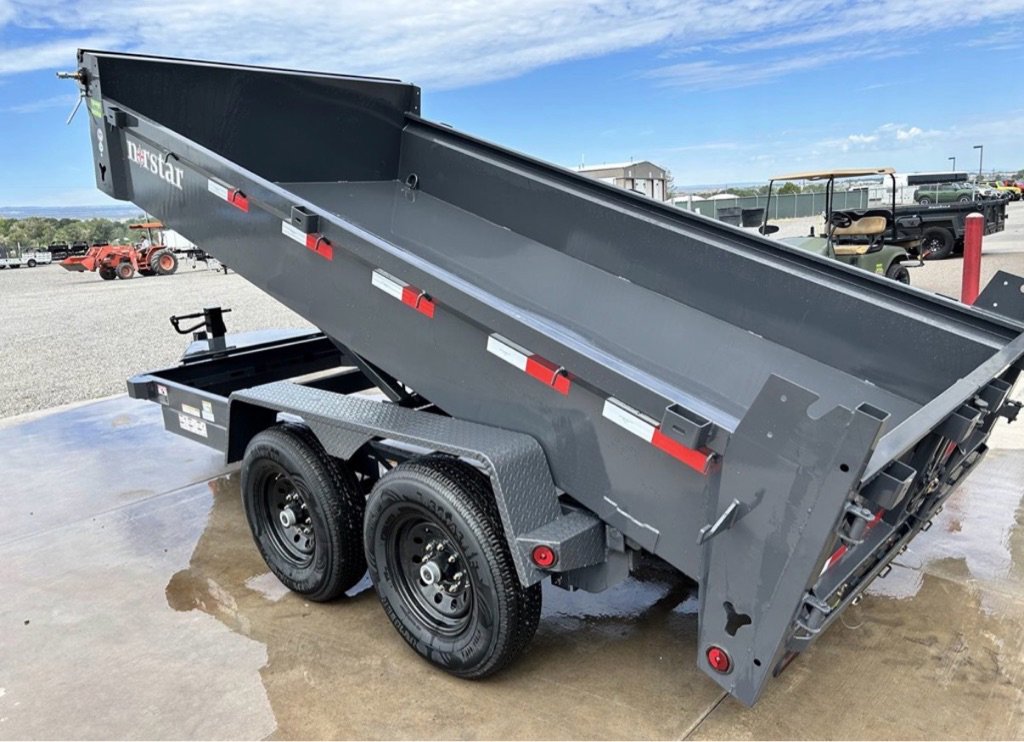 NORSTAR 7’X14′ DUMP TRAILER 14K Rated, Slide Out Ramps, Scissor Style Hoist, Adjustable Coupler, Reflective DOT Marking Tape, Gray Powder Coated, Roll Up Tarp Kit, All LED Lighting, 16” Radial Tires, Electric Brakes On All Wheels, Heavy Duty Diamond Plate Fenders, Heavy Duty Spring Loaded Drop Leg Jack, D-Rings, Spare Tire Carrier, Locking Tongue Box, Iron Clad Warranty
