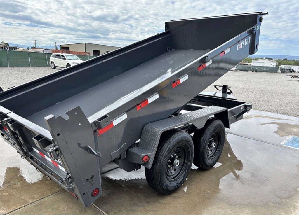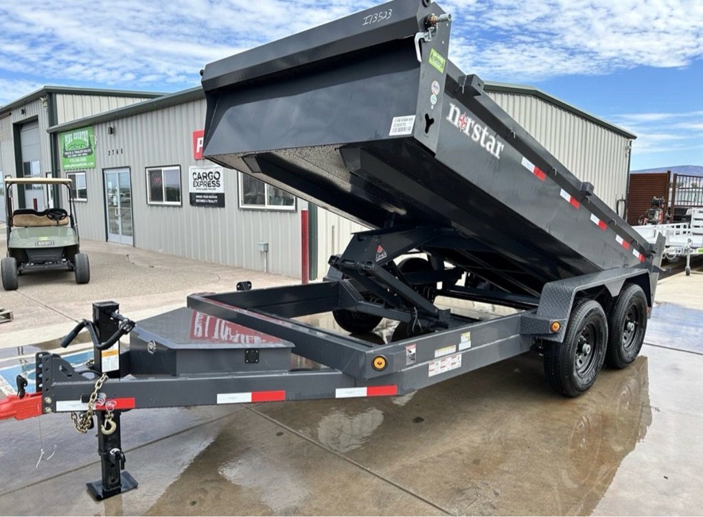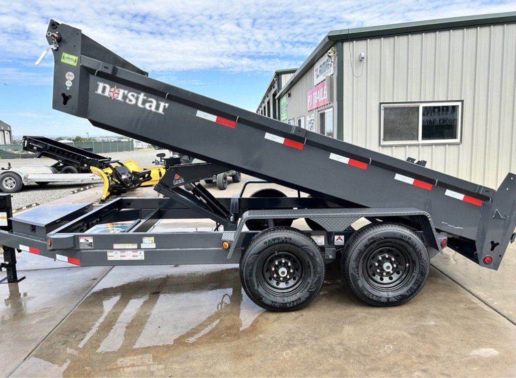NORSTAR 7’X14′ DUMP TRAILER 14K Rated, Slide Out Ramps, Scissor Style Hoist, Adjustable Coupler, Reflective DOT Marking Tape, Gray Powder Coated, Roll Up Tarp Kit, All LED Lighting, 16” Radial Tires, Electric Brakes On All Wheels, Heavy Duty Diamond Plate Fenders, Heavy Duty Spring Loaded Drop Leg Jack, D-Rings, Spare Tire Carrier, Locking Tongue Box, Iron Clad Warranty