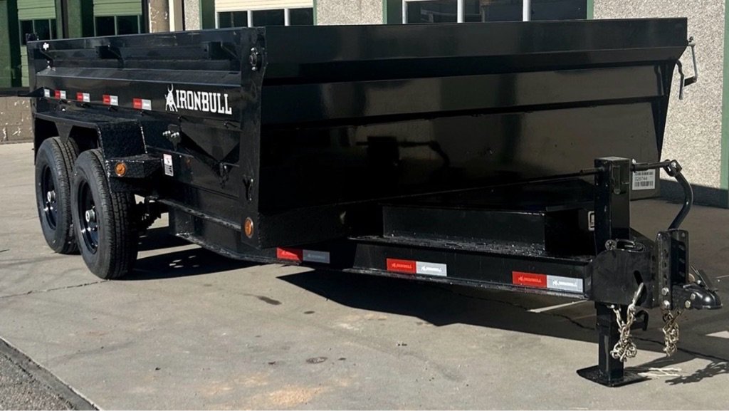 IRONBULL 83”X14′ DUMP TRAILER 14K Rated, 24”Tall Side Walls, 7 Gauge Floor, Slide Out **ALUMINUM RAMPS**Ramps, D-Rings, Roll Up Tarp Kit, All LED Lighting, Heavy Duty Diamond Plate Fenders, Adjustable Coupler, 16” Radial Tires, Electric Brakes On All Wheels, Scissor Style Hoist, Spare Tire Carrier, 3 Way Combo Spreader Gate, Powder Coated, Heavy Duty Spring Loaded Jack, Locking Box, Plug In Wall Charger, Reflective DOT Marking Tape, Iron Clad Warranty. DRY WEIGHT: 5038