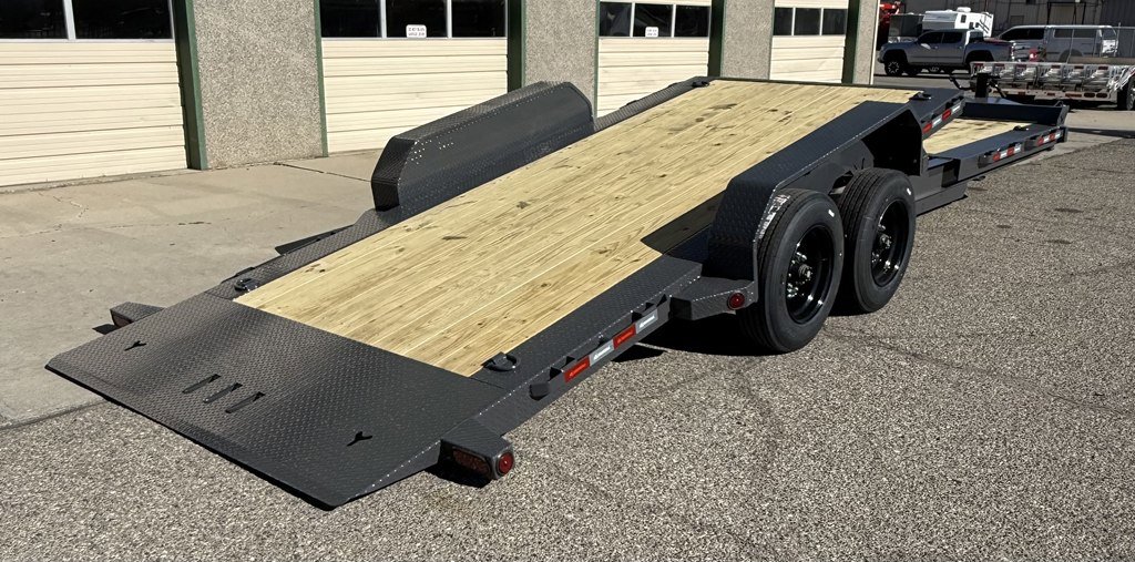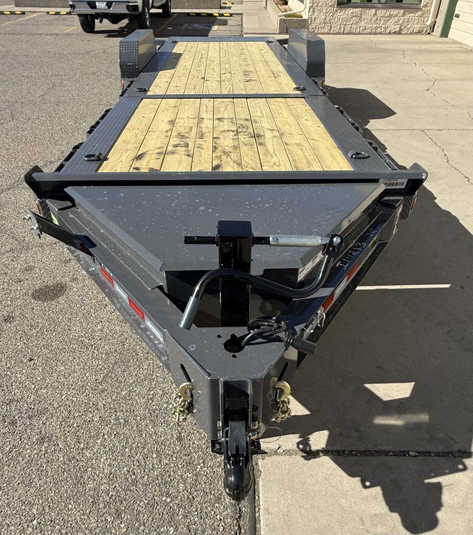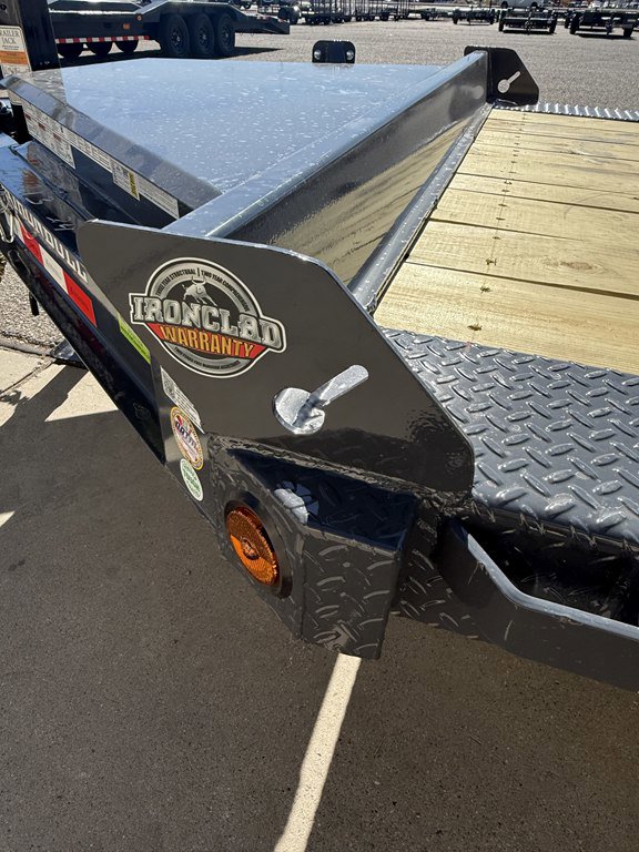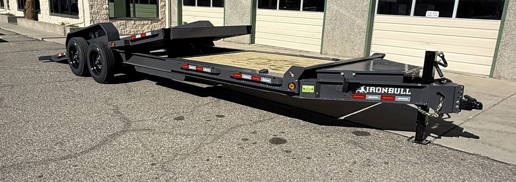 Ironbull 24′ Gravity Tilt Trailer, 16k Rated , 8 I beam Frame 2 5/16 Adjustable Couple, 10 k Rated Spring Loaded Jack, Treated Wood Floor,Chain Box,Weld on D rings, Spare Tire Mount, Drive Over Fenders, 16 Tilt , 8′ Stationary deck, 16 ply Tires Iron Clad Warranty
