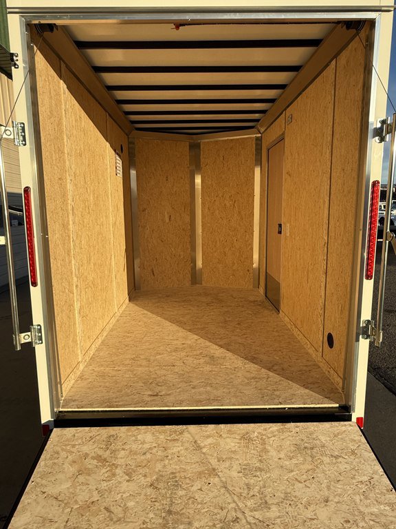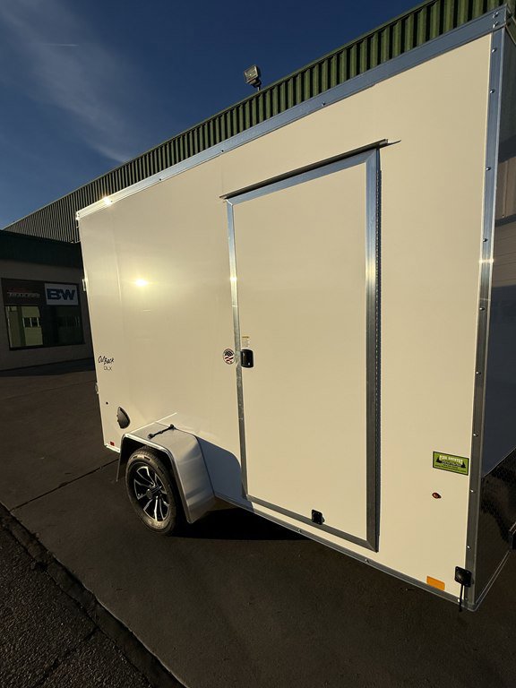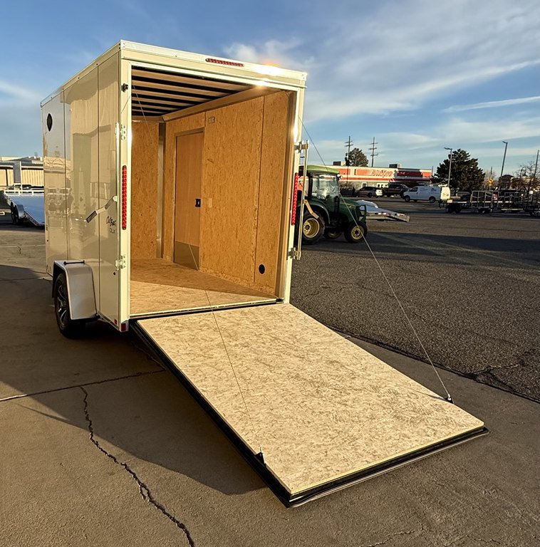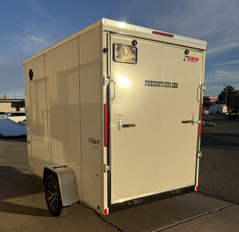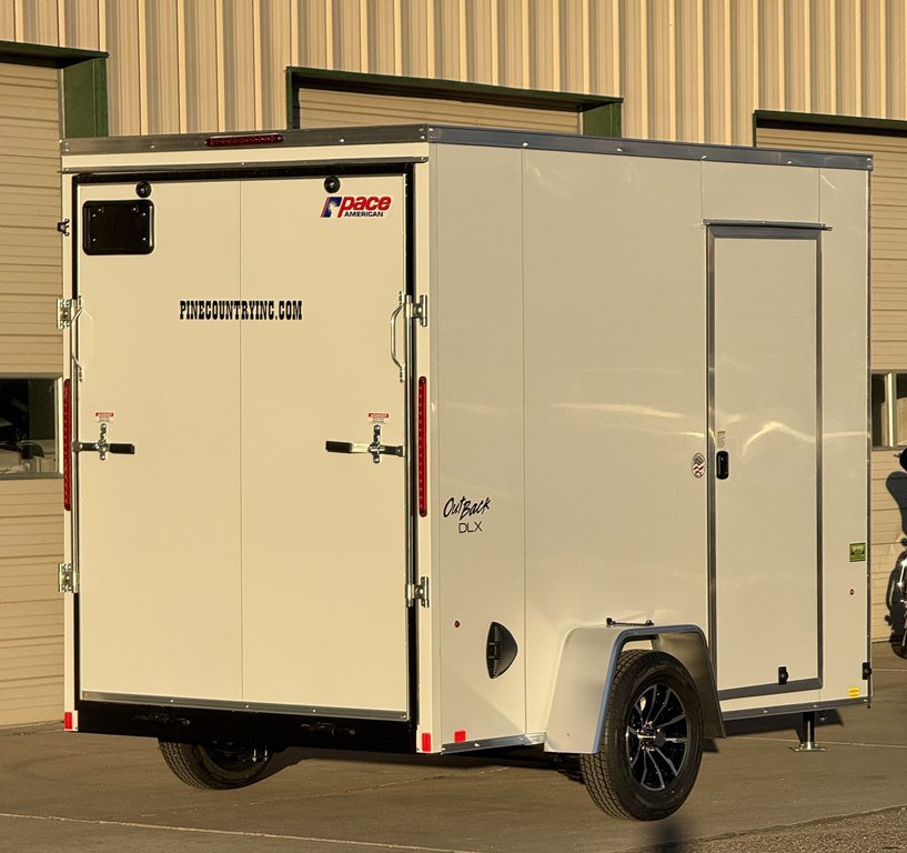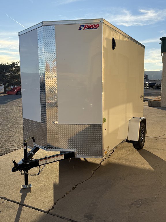 PACE 6X10 SINGLE AXLE ENCLOSED TRAILER Cable Assisted Ramp Door, V-Nose, Side Access Door With RV Latch, All LED Lighting, 6-1/2 Interior Height, Dry Max Interior, Dome Light, ATP Stone Guard, ATP Fenders.Bonded Smooth Sides, Custom Wheels 15 Radial Tires, 3500# Axle, Side Wall Vents. Empty Weight 1350