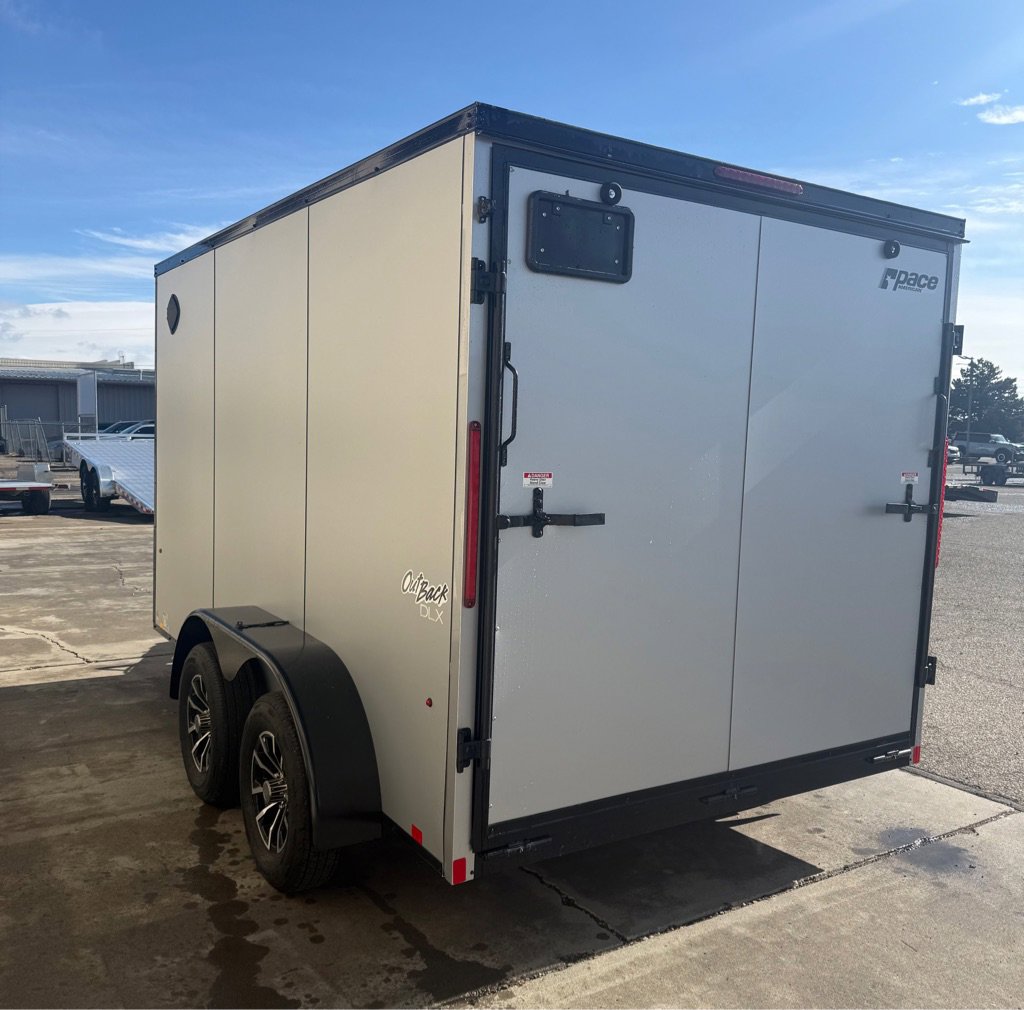 PACE OUTBACK 7 X 14 TANDEM AXLE ENCLOSED TRAILER 7K Rated, V-Nose, Cable Assisted Rear Ramp Door, Side Access Door, ATP Front Stone Guard, All LED Lighting, 7 Foot Interior Height, Dry Max Flooring, 15 Inch Radial Tires, Electric Brakes On All Wheels, Side Wall Flow Through Vents, 12-Volt Interior Dome Light. Empty Weight 1995