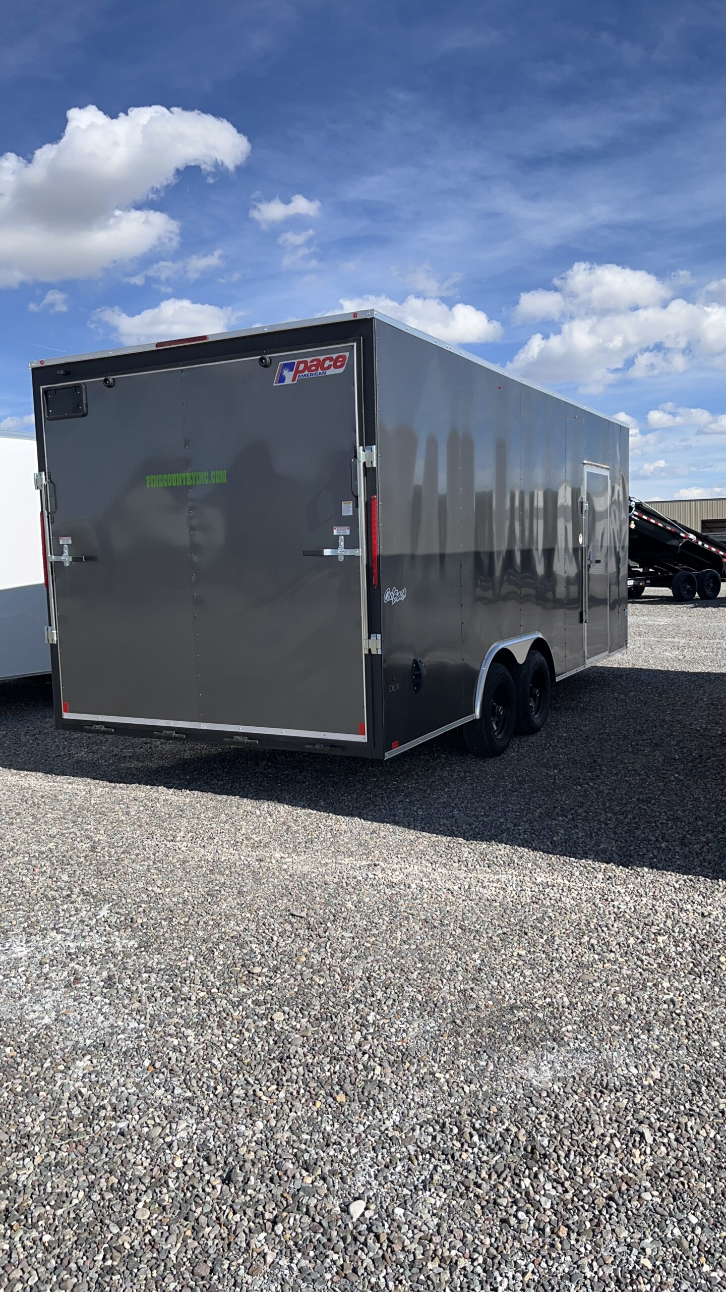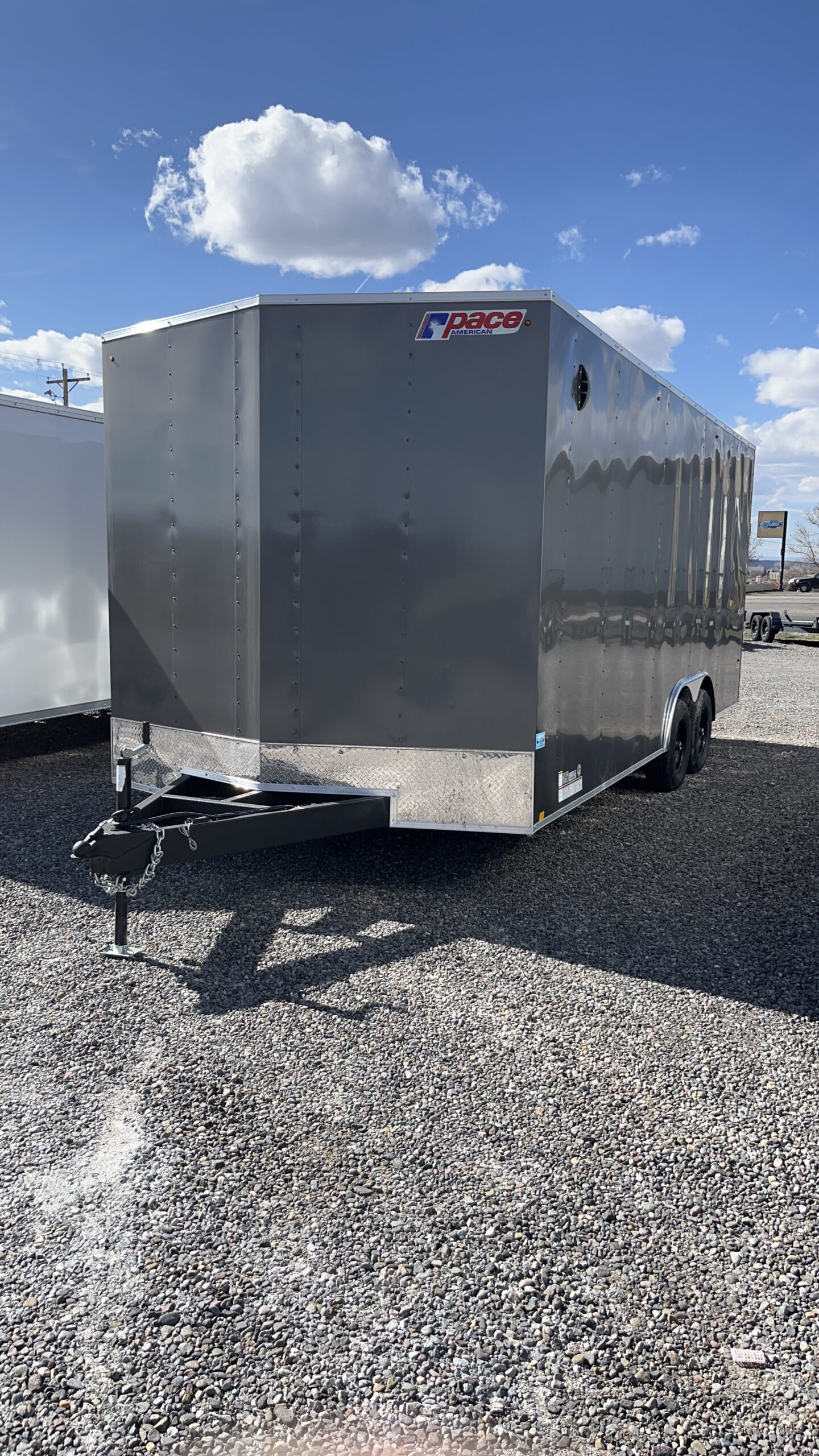 PACE 8-1/2’X20′ TANDEM AXLE ENCLOSED TRAILER10K Rated, Cable Assisted Ramp Door, V-Nose, ATP Stone Guard, 7′ Interior Height, All LED Lighting, Side Wall Flow Through Vents, Screwless Exterior, Side Door With RV Latch, 15” Radial Tires, Electric Brakes On All Wheels, Dry Max Interior, Recessed Heavy Duty D-Rings, Two 12-Volt Interior Dome Lights, Dove Tail. Empty Weight 3528