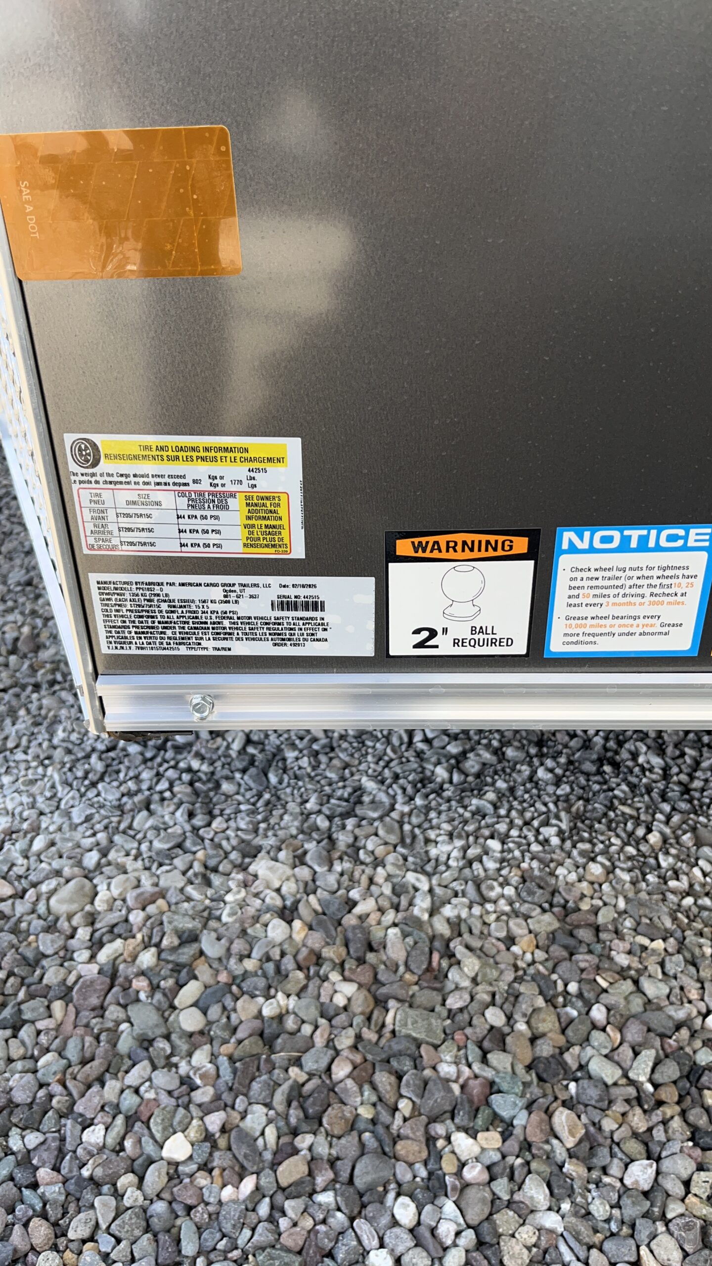 6’6″ INSIDE HEIGHT, TUBE ROOF BOWS 24″ CENTERS, 2″ 5K COUPLER, V NOSE, STANDARD A FRAME TONGUE, CROSS MEMBERS 16″ CENTERS, PASSPORT, ST205/75R15 5B SILVER MOD WHEEL, 3.5K SPRING NO BRAKE AXLE, STEEL FRAME, 2″X3″ MAIN RAILS, 2K TOP WIND TONGUE JACK, 76 1/2 TUBE POSTS, VERTICAL POSTS 16″ CENTERS, FLAT ROOF, 1/4″X27″ SAFETY CHAINS W/SLIP HOOK, SINGLE AXLE, SIDEWALL FLOW THRU VENTS, 3/4″ DECKING, 5K D RING, 12V DOME LIGHT, LICENSE PLATE BRACKET WITH LIGHT, LED LIGHTS, COLOR COATED SCREWS, 1 PC ALUMINUM ROOF, SMOOTH ALUMINUM RADIUS FENDERS, 16″ STARBRIGHT STONE GUARD, 2K REAR RAMP DOOR W/EXTENSION, 32″X72″ DOOR RH HINGE.