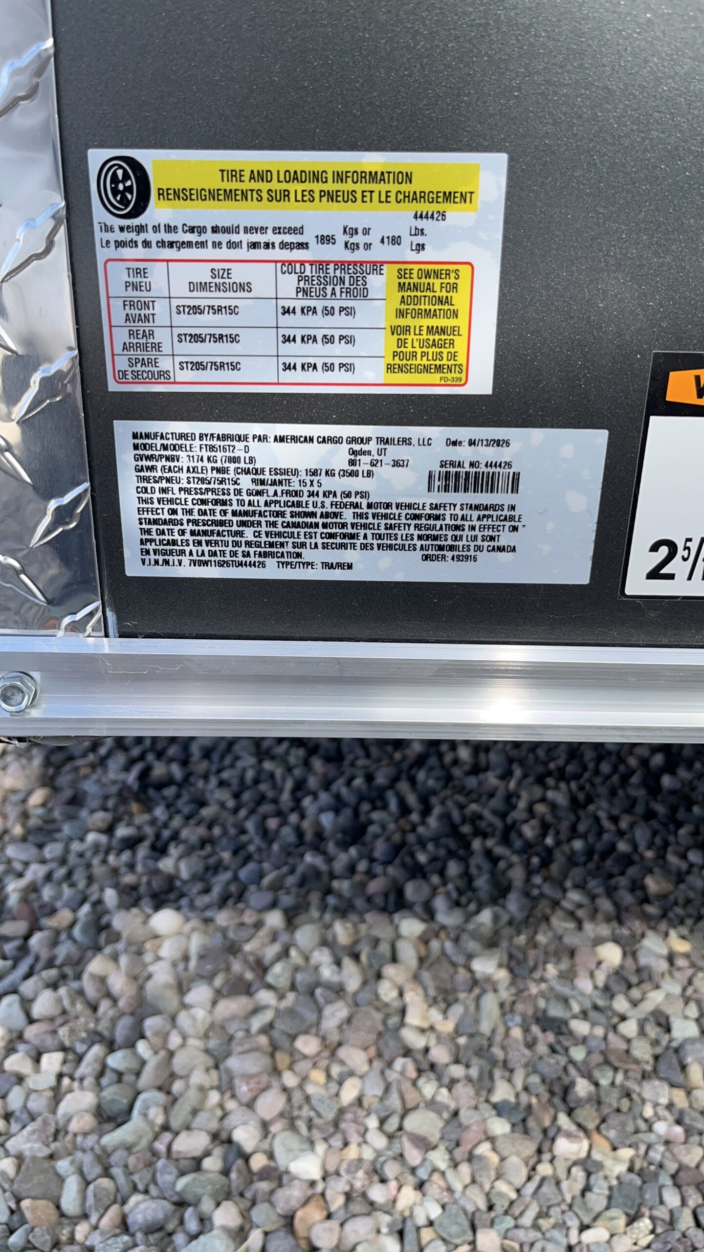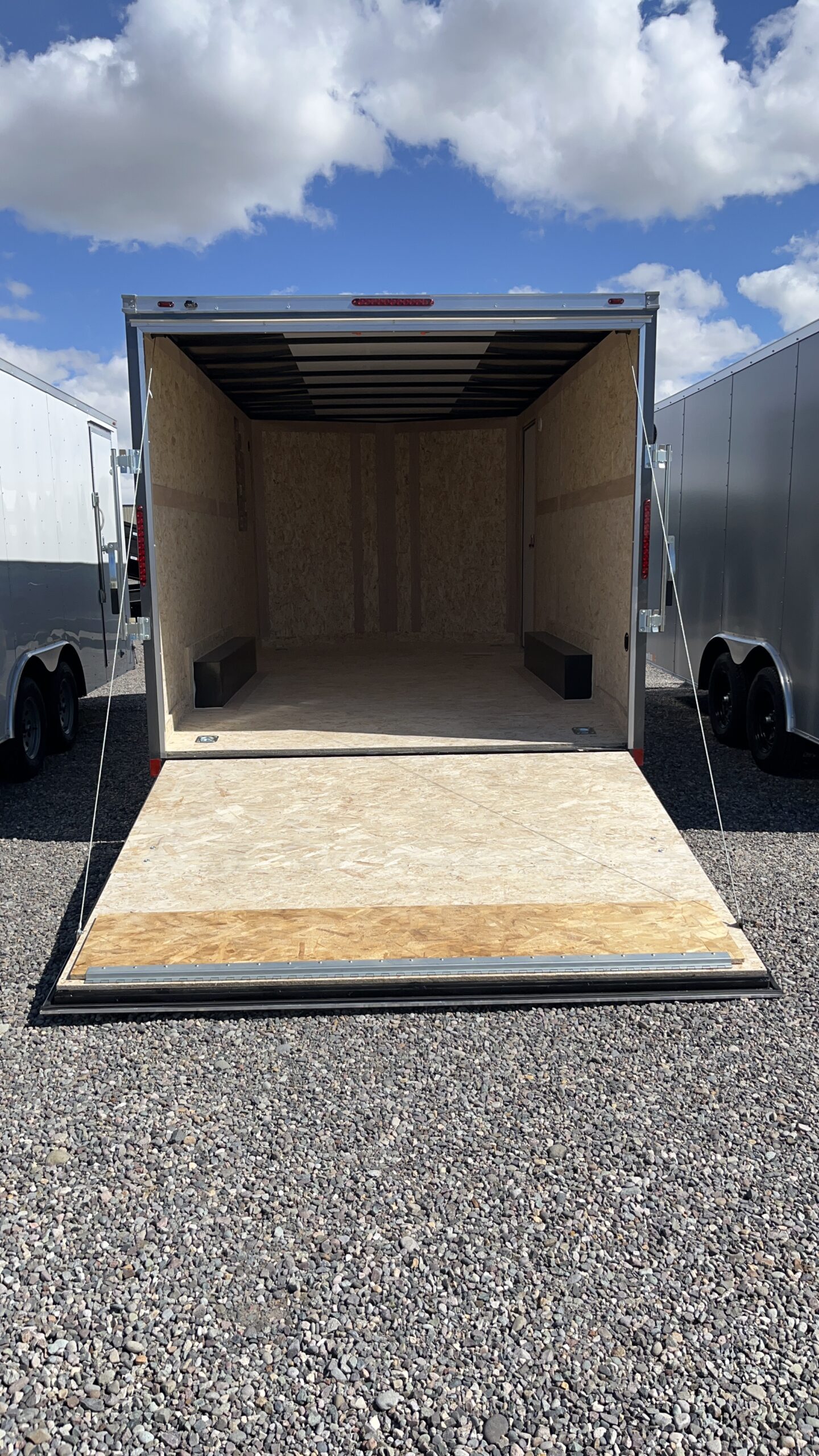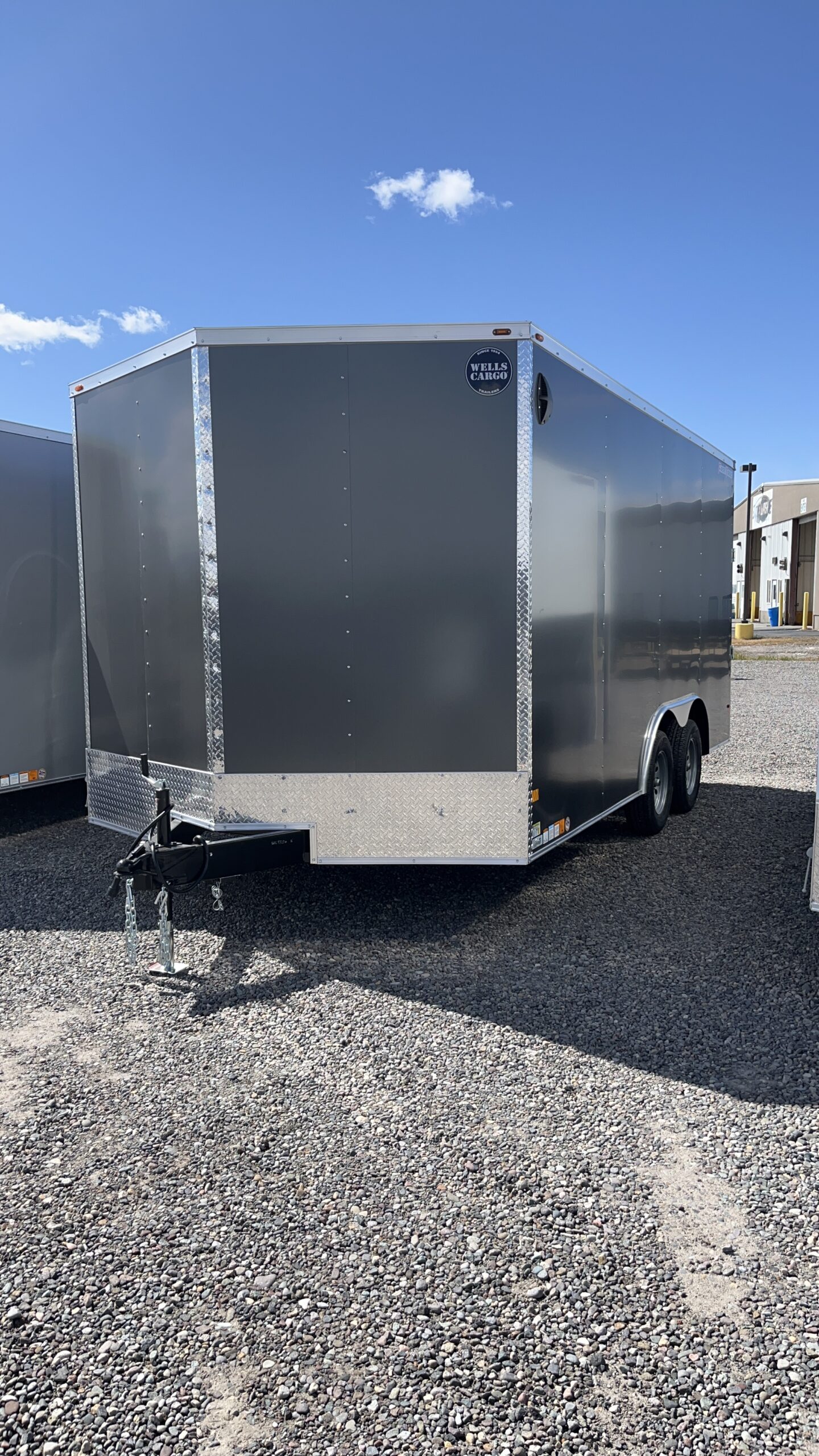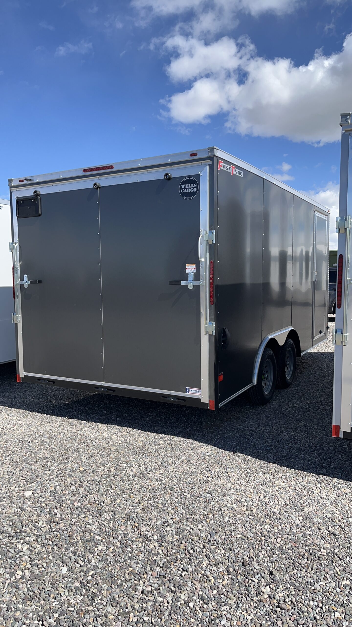 WELLS CARGO FAST TRAC 8.5X16 ENCLOSED SILVER FROST TRAILER WITH RAMP DOOR AND SIDE DOOR. 7′ INSIDE HEIGHT. TANDEM AXLE 3500 AXLES FOR 7000 GVWR. BUMPER PULL WITH 2 5/16 COUPLER. ST205/75R15 5B BLACK MOD STEEL WHEELS. 24″ BEAVER TAIL.