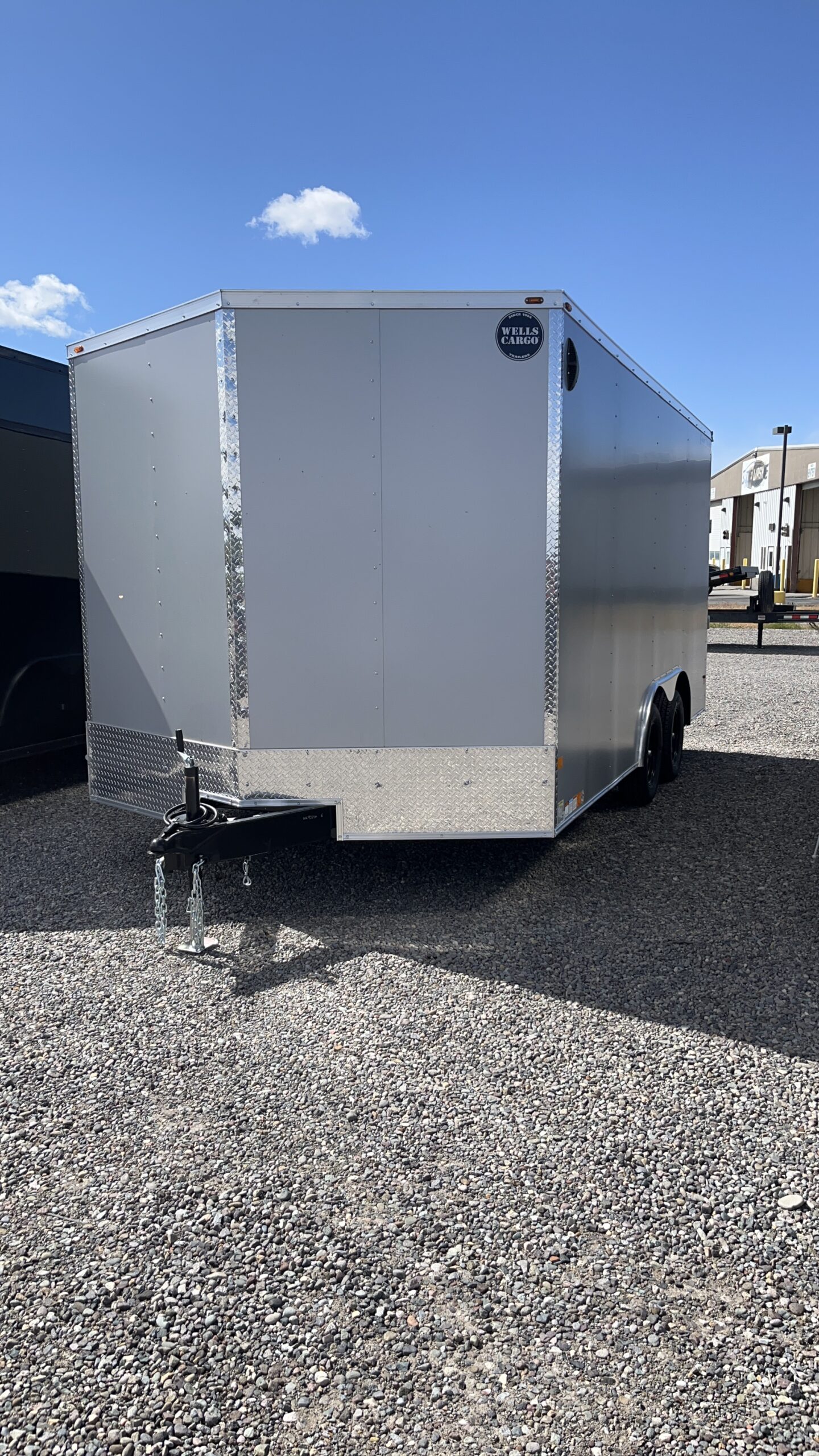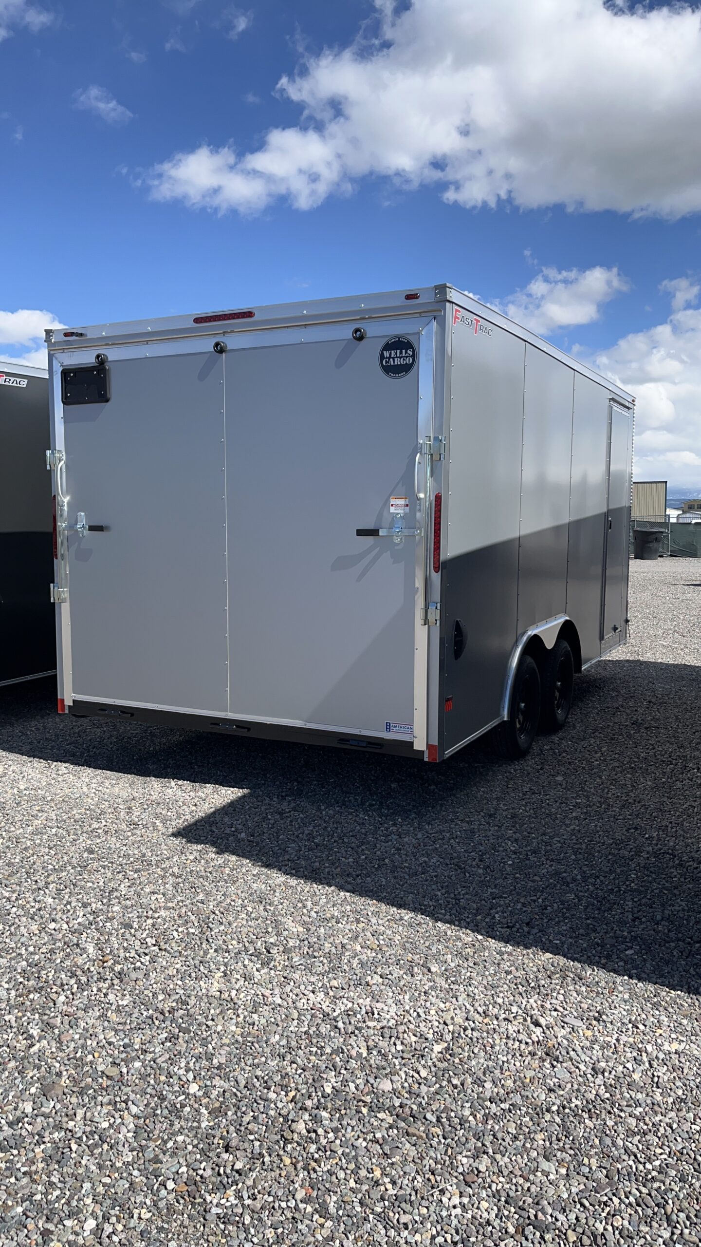 WELLS CARGO FAST TRAC 8.5X16 ENCLOSED SILVER FROST TRAILER WITH RAMP DOOR AND SIDE DOOR. 7′ INSIDE HEIGHT. TANDEM AXLE 3500 AXLES FOR 7000 GVWR. BUMPER PULL WITH 2 5/16 COUPLER. ST205/75R15 5B BLACK MOD STEEL WHEELS. 24″ BEAVER TAIL.